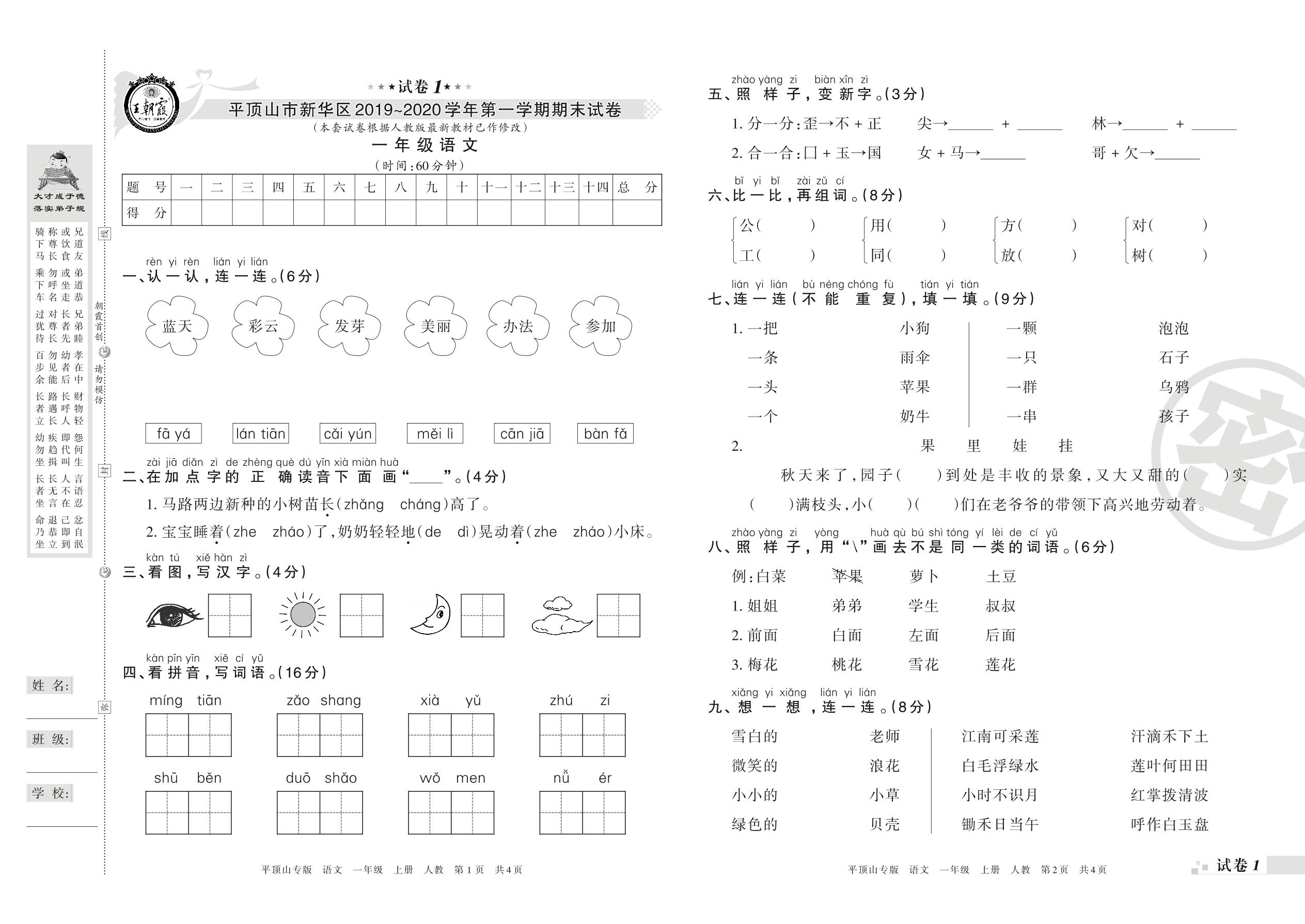 2019-2020学年第一学期平顶山市新华区一年级语文试卷(人教版)【1】