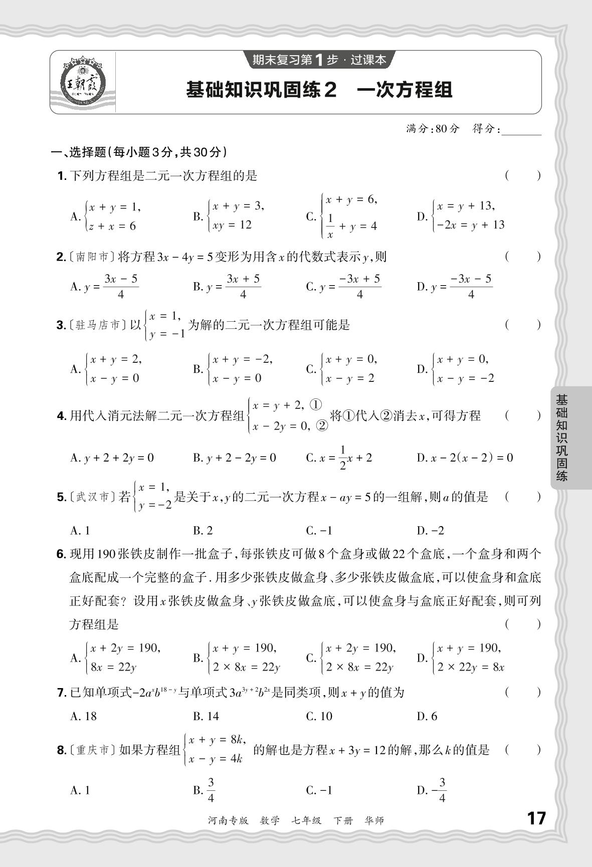 2024春下册七年级数学华师版 期末过课本河南版·基础知识巩固练 一次方程组【2】