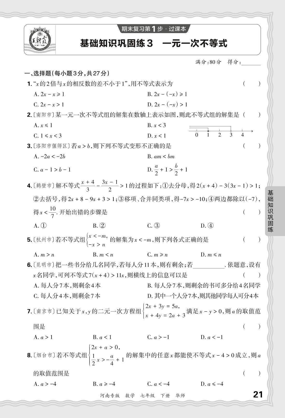 2024春下册七年级数学华师版 期末过课本河南版·基础知识巩固练 一元一次不等式【3】