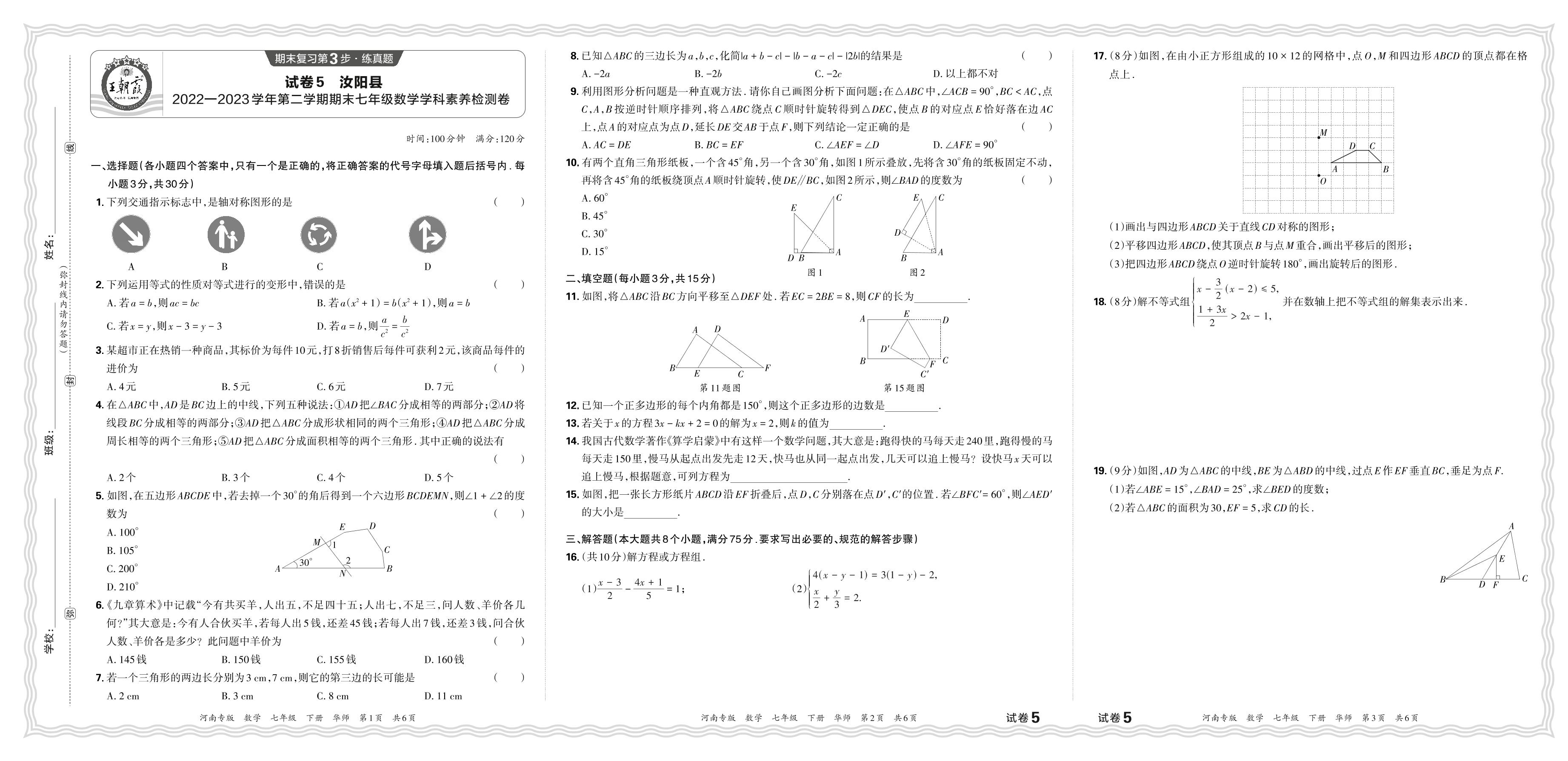 河南省汝阳县2022-2023学年第二学期期末七年级数学学科素养检测卷(华师版)【5】