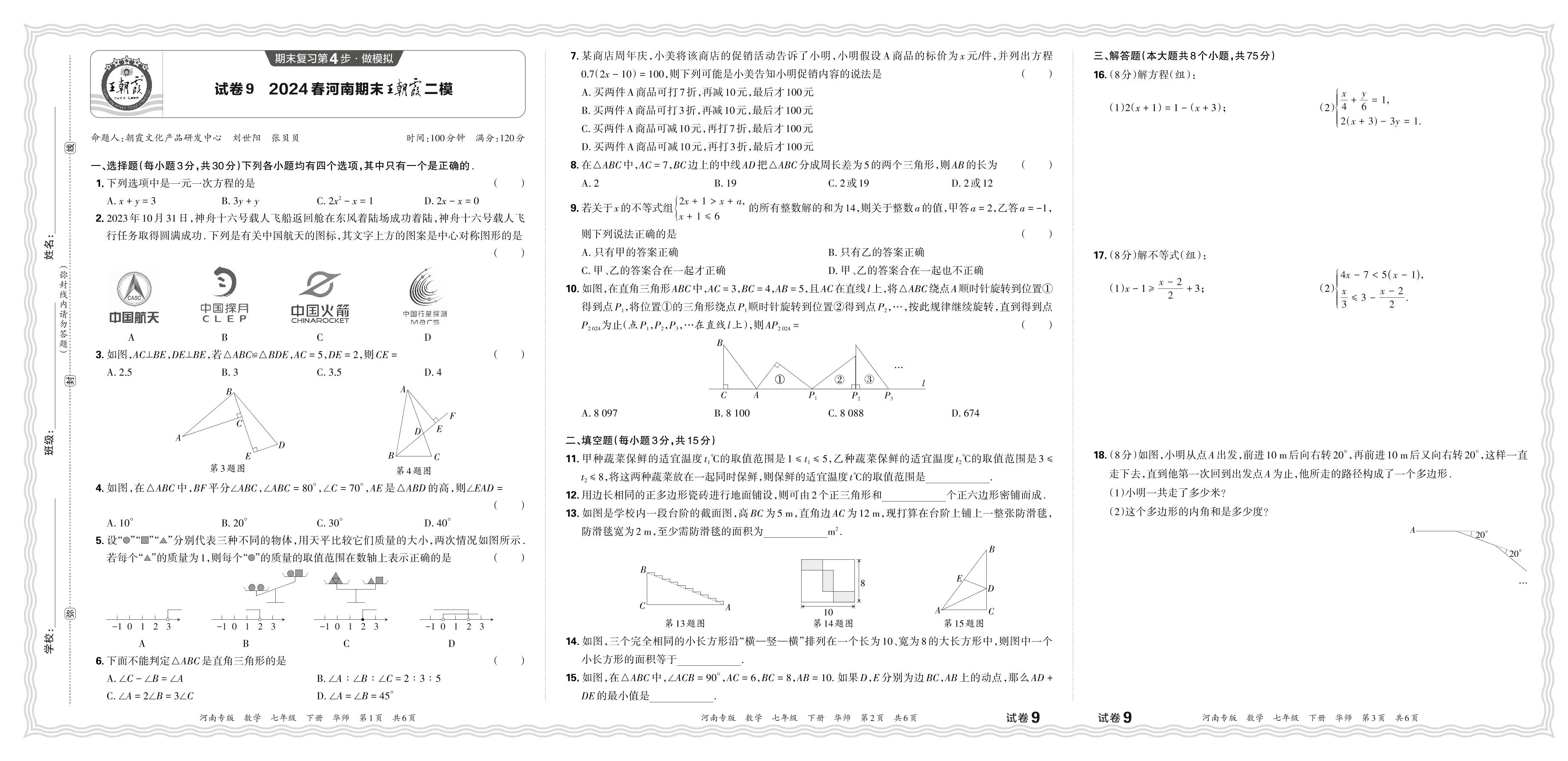 2024春下册七年级数学华师版 河南期末王朝霞二模