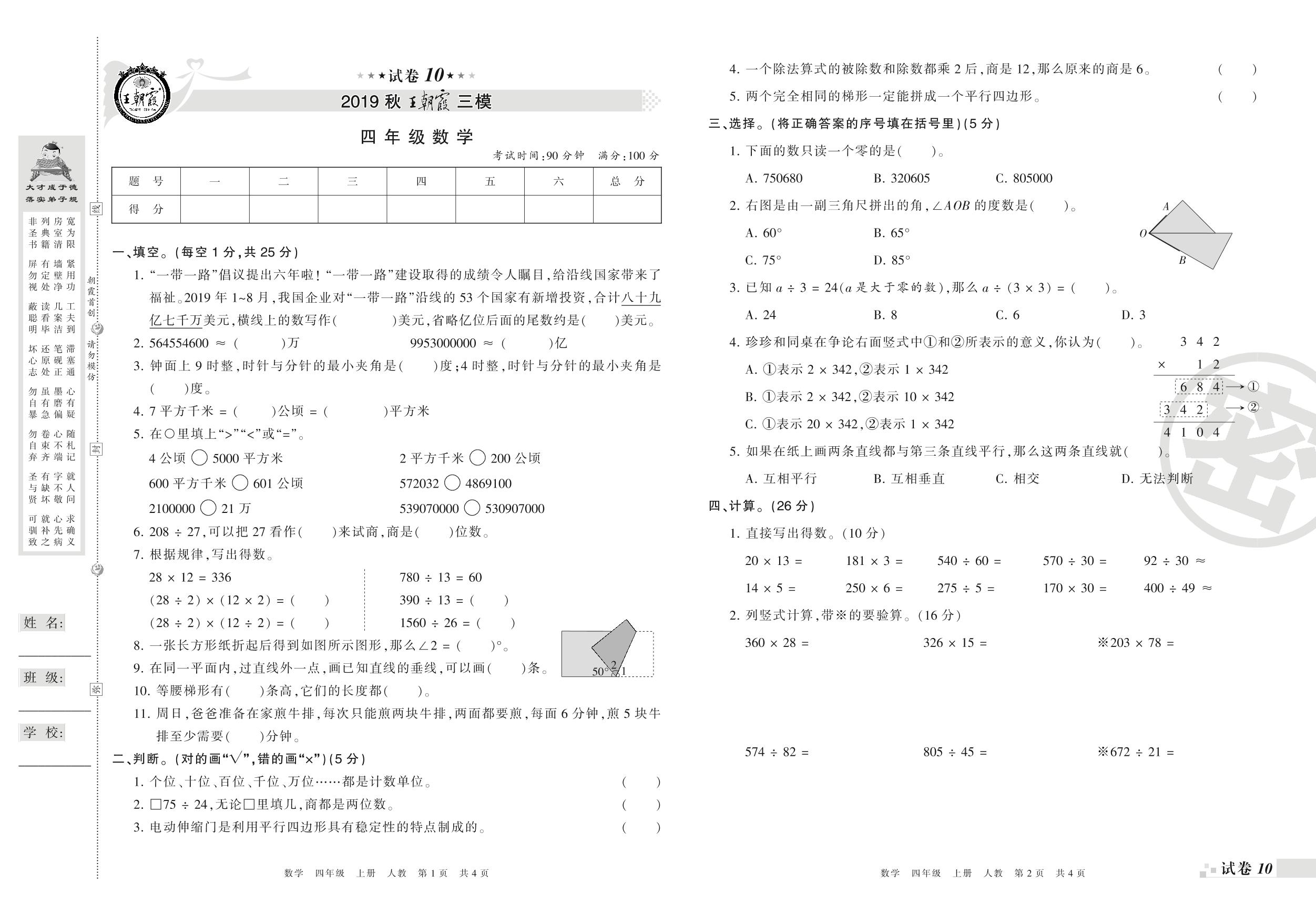 王朝霞期末模拟卷四年级上册数学(人教版)_R210804144631【10】