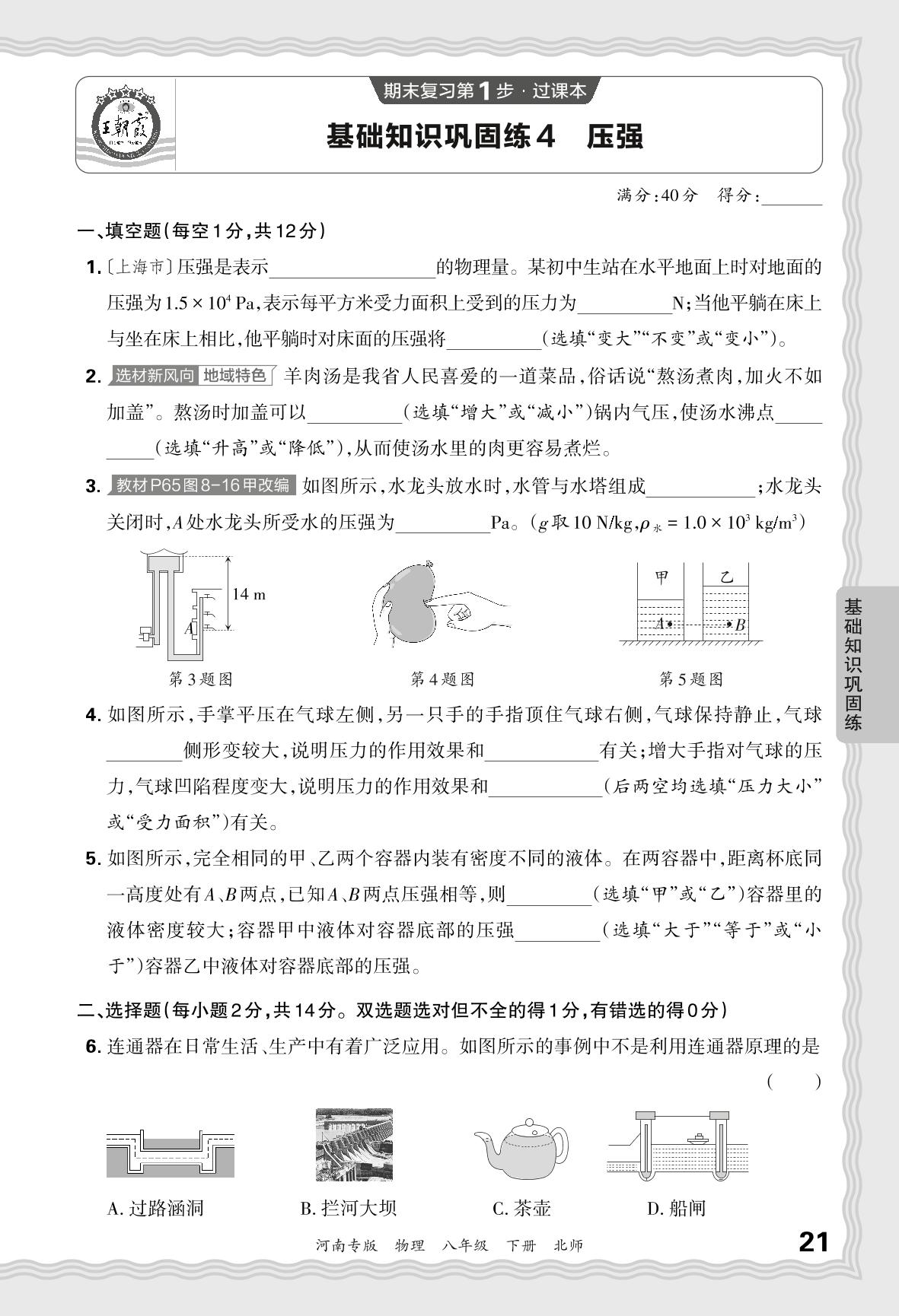 2024春下册八年级物理北师版 期末过课本河南版·基础知识巩固练 压强【4】