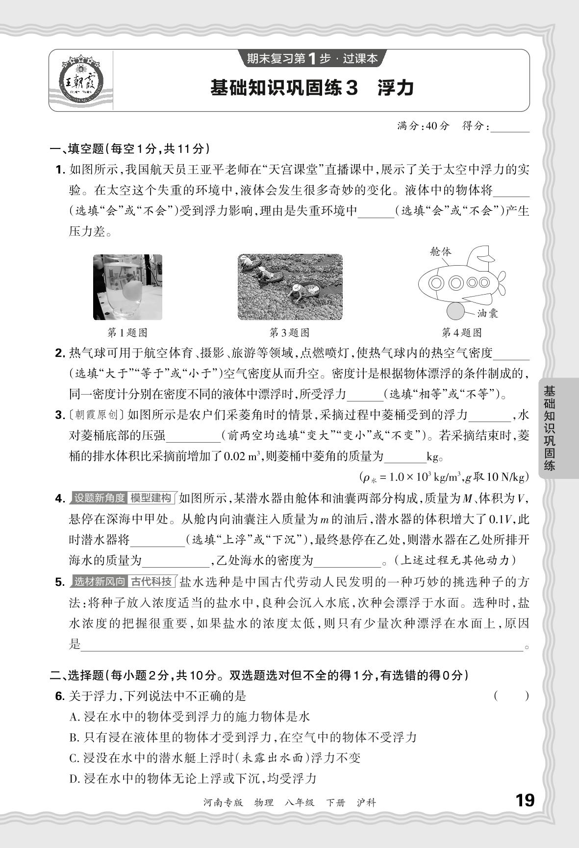 2024春下册八年级物理沪科版 期末过课本河南版·基础知识巩固练 浮力【3】