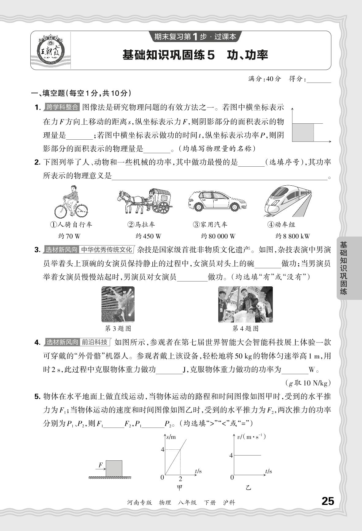 2024春下册八年级物理沪科版 期末过课本河南版·基础知识巩固练 功、功率【5】