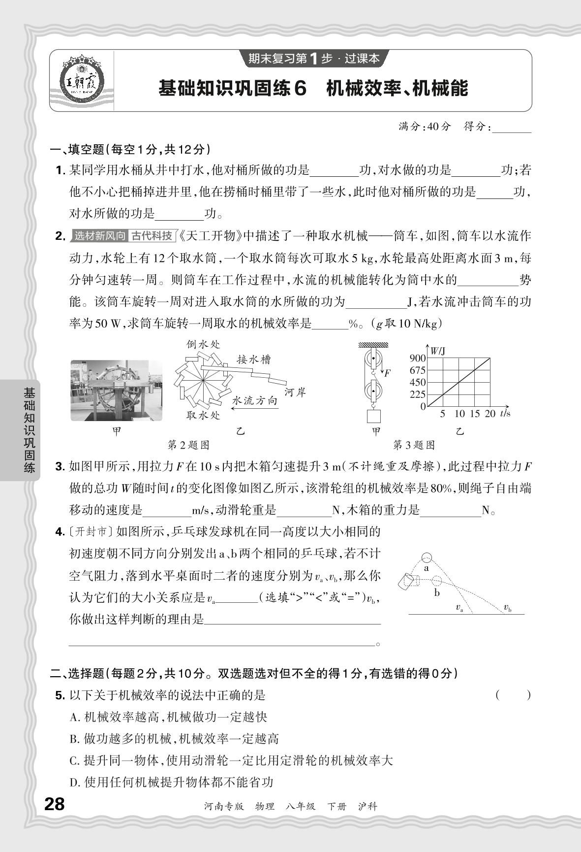 2024春下册八年级物理沪科版 期末过课本河南版·基础知识巩固练 机械效率、机械能【6】