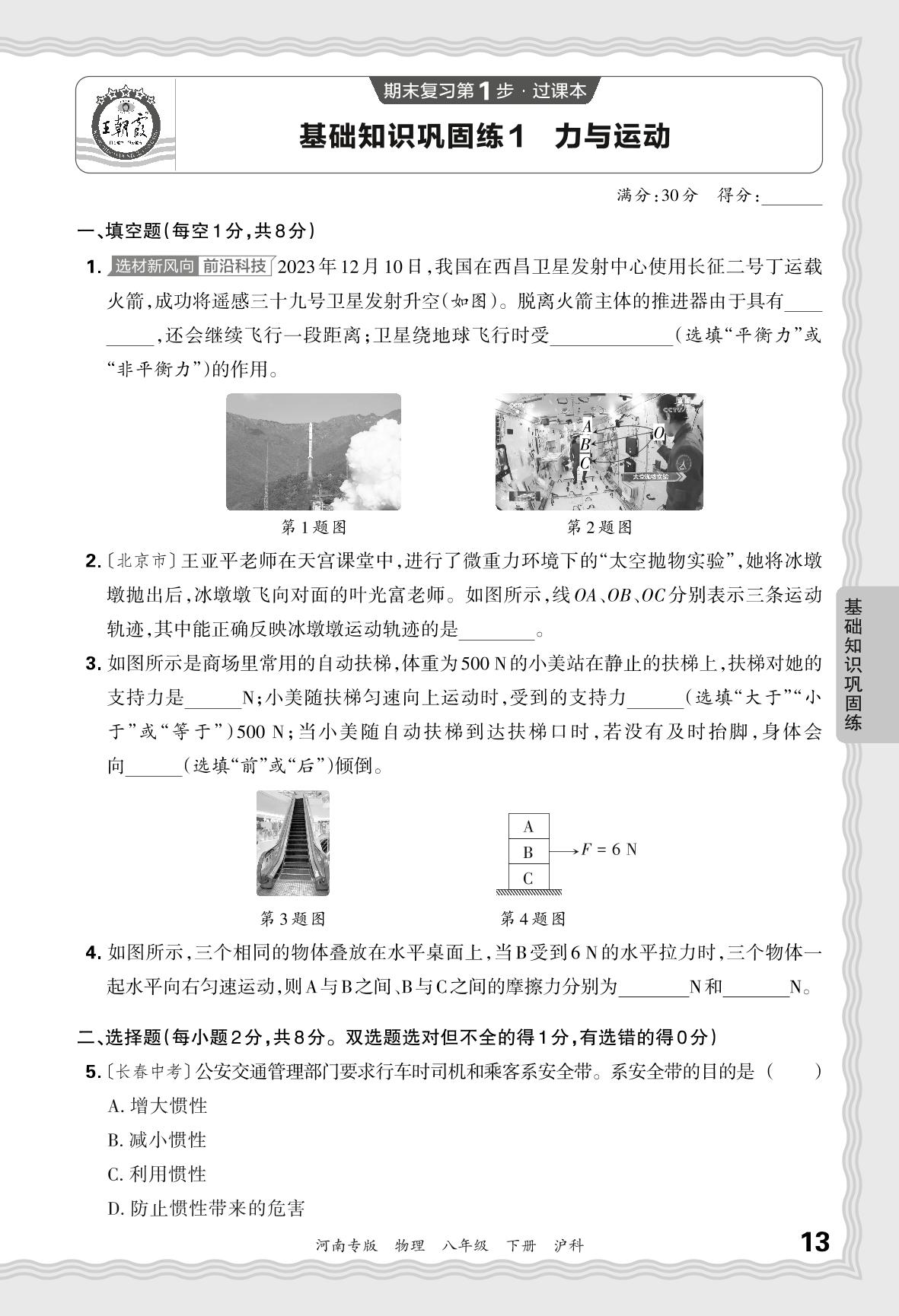 2024春下册八年级物理沪科版 期末过课本河南版·基础知识巩固练 力与运动【1】