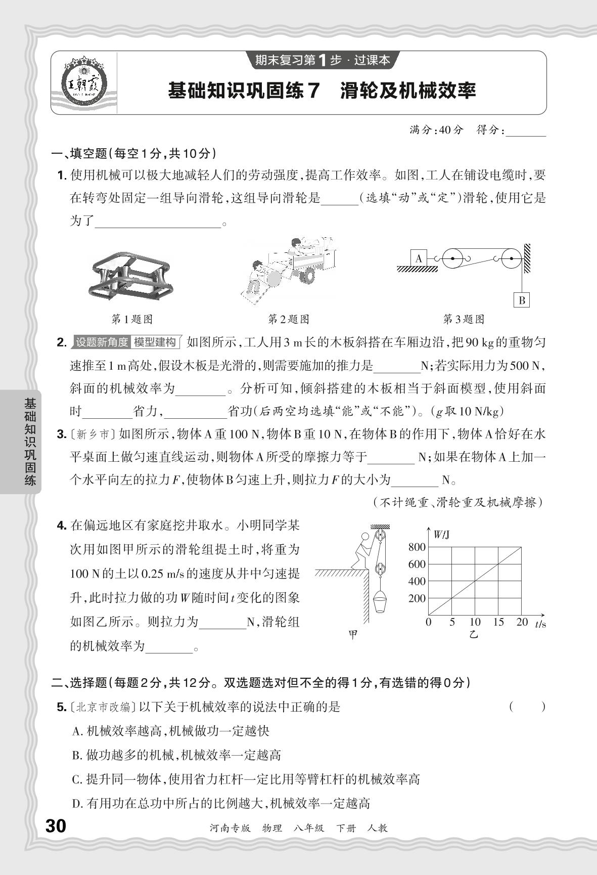 2024春下册八年级物理人教版 期末过课本河南版·基础知识巩固练 滑轮及机械效率【7】