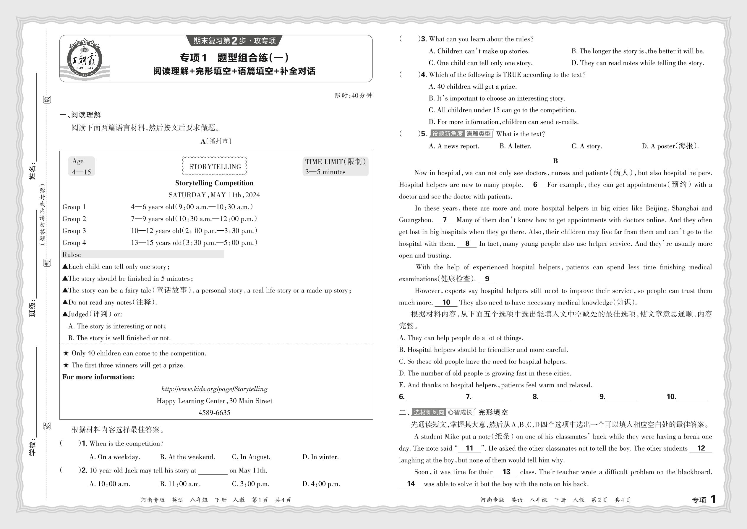2024春下册八年级英语人教版 期末专项卷河南版·题型组合练(一)