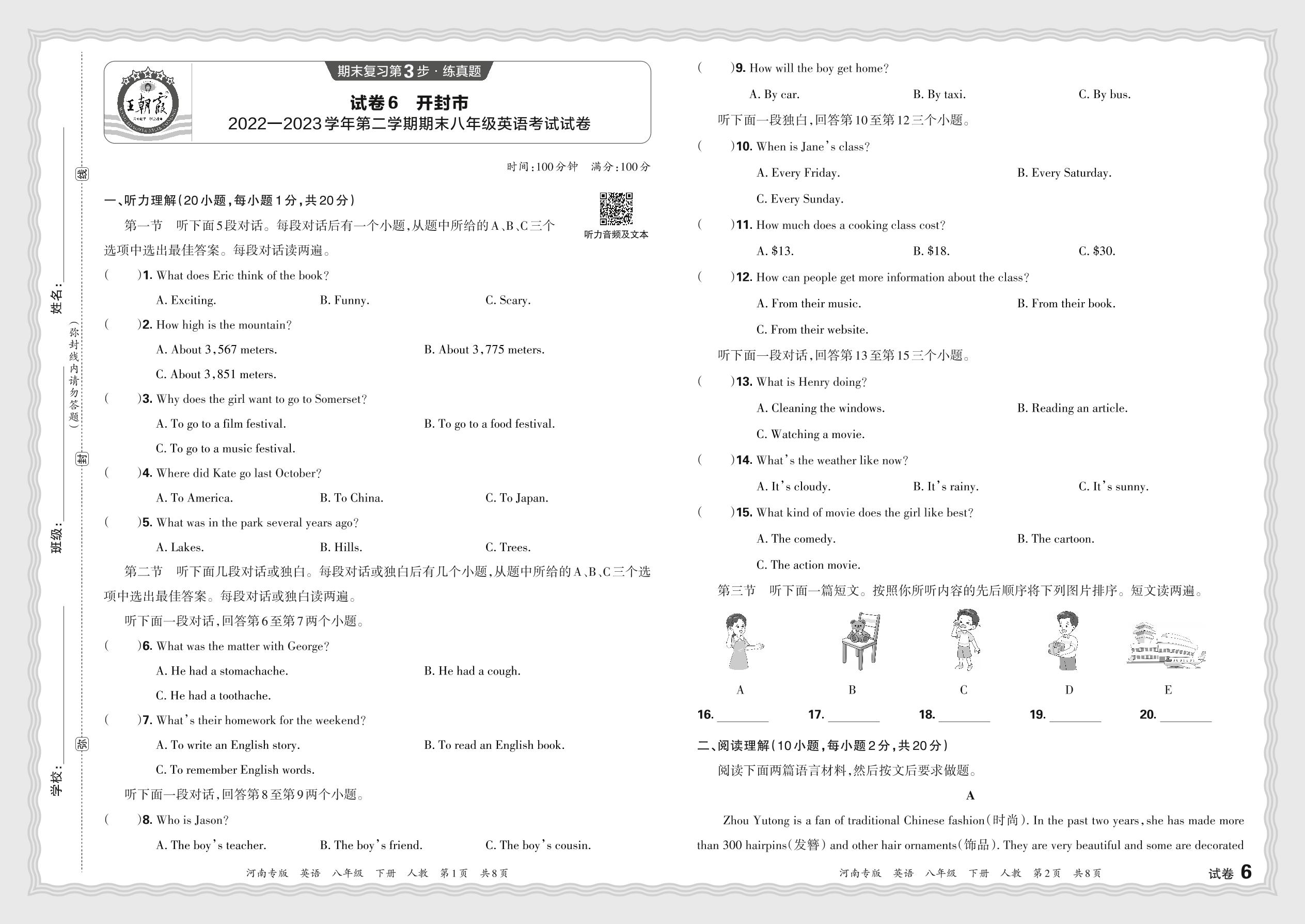 河南省开封市2022-2023学年第二学期期末八年级英语考试试卷(人教版)【6】