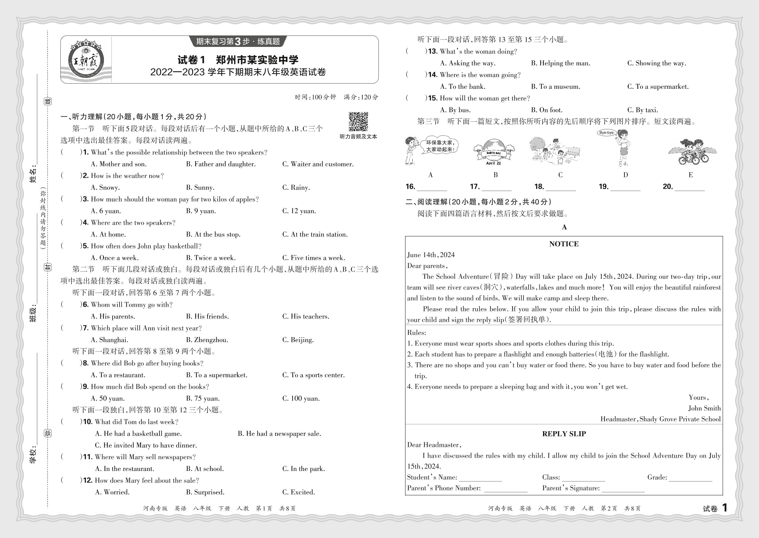 河南省郑州市某实验中学2022-2023学年下学期期末八年级英语试卷(人教版)【1】