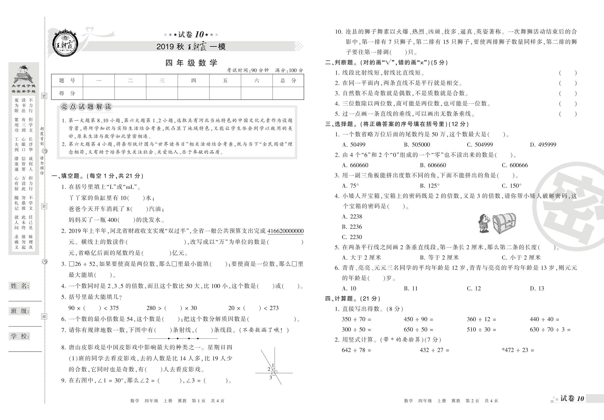 王朝霞期末模拟卷四年级上册数学(冀教版)_R210804144709【10】