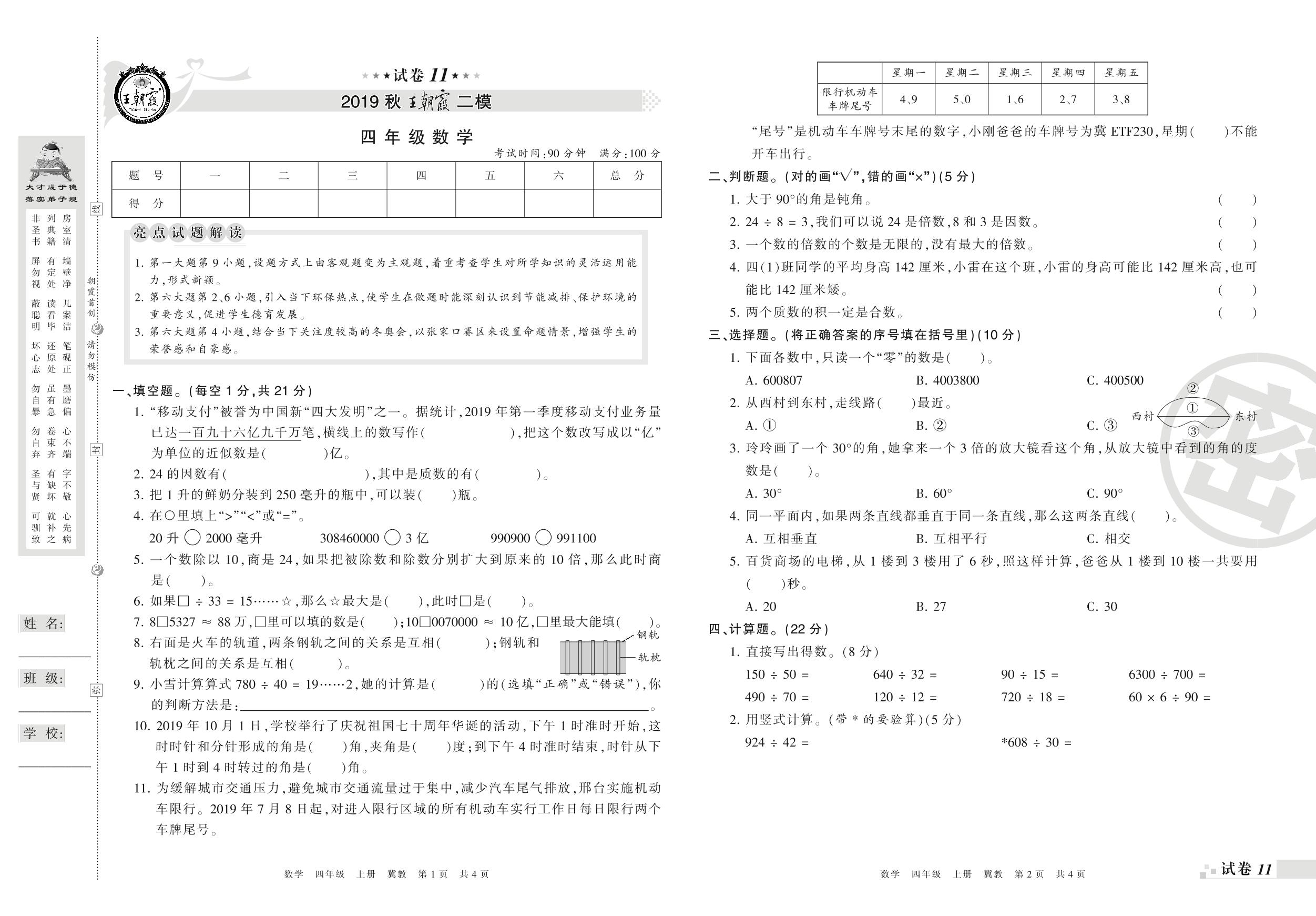 王朝霞期末模拟卷四年级上册数学(冀教版)_R210804144713【11】