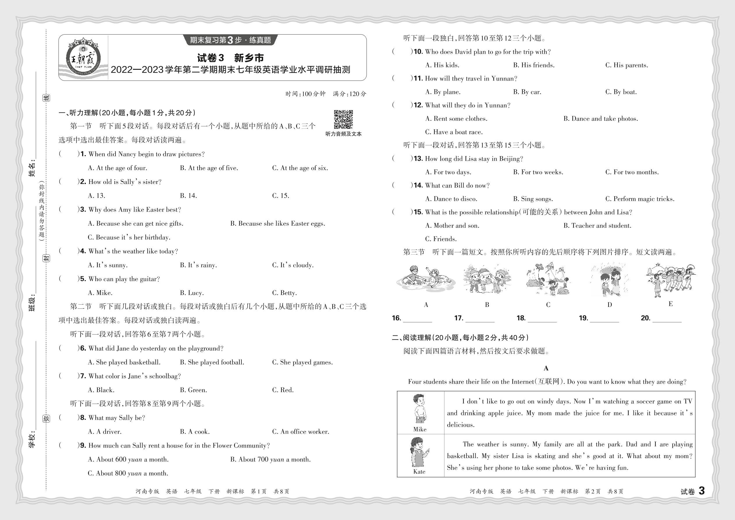 河南省新乡市2022-2023学年第二学期期末七年级英语学业水平调研抽测(新课标版)【3】