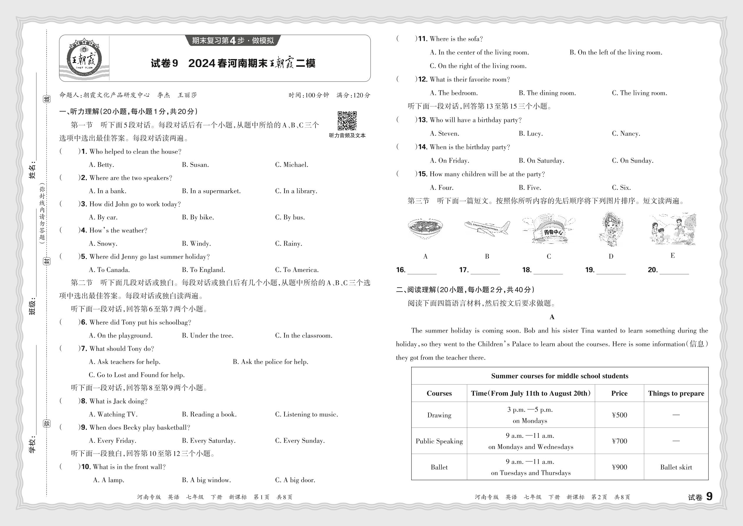 2024春下册七年级英语新课标版 河南期末王朝霞二模