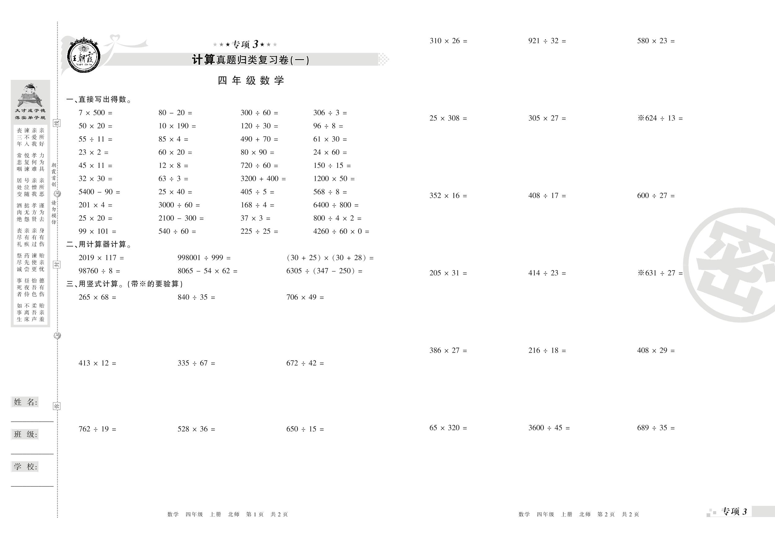 王朝霞期末专项卷——计算真题归类复习四年级上册数学(北师版)_R210804144725【0】