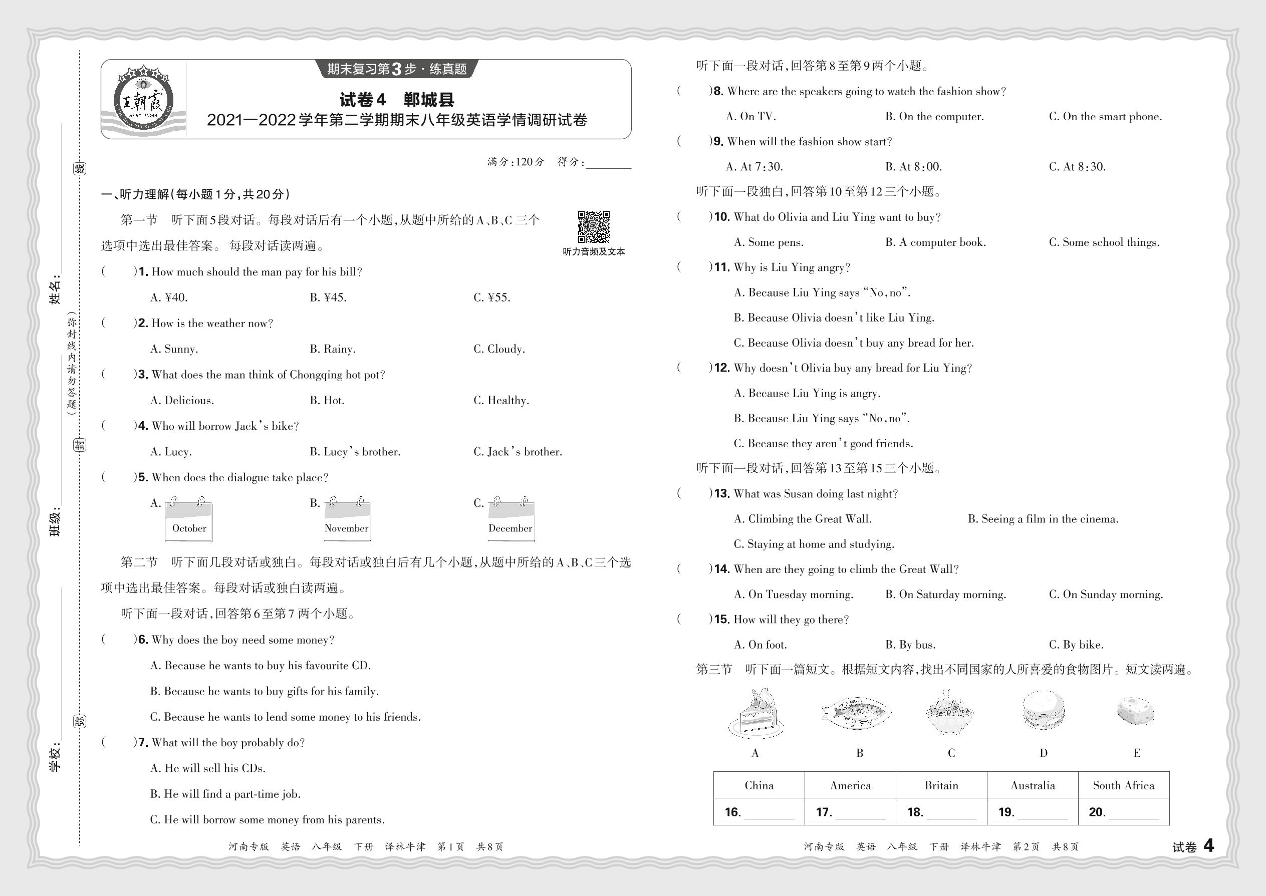 河南省郸城县2021-2022学年第二学期期末八年级英语学情调研试卷(译林牛津版)【4】