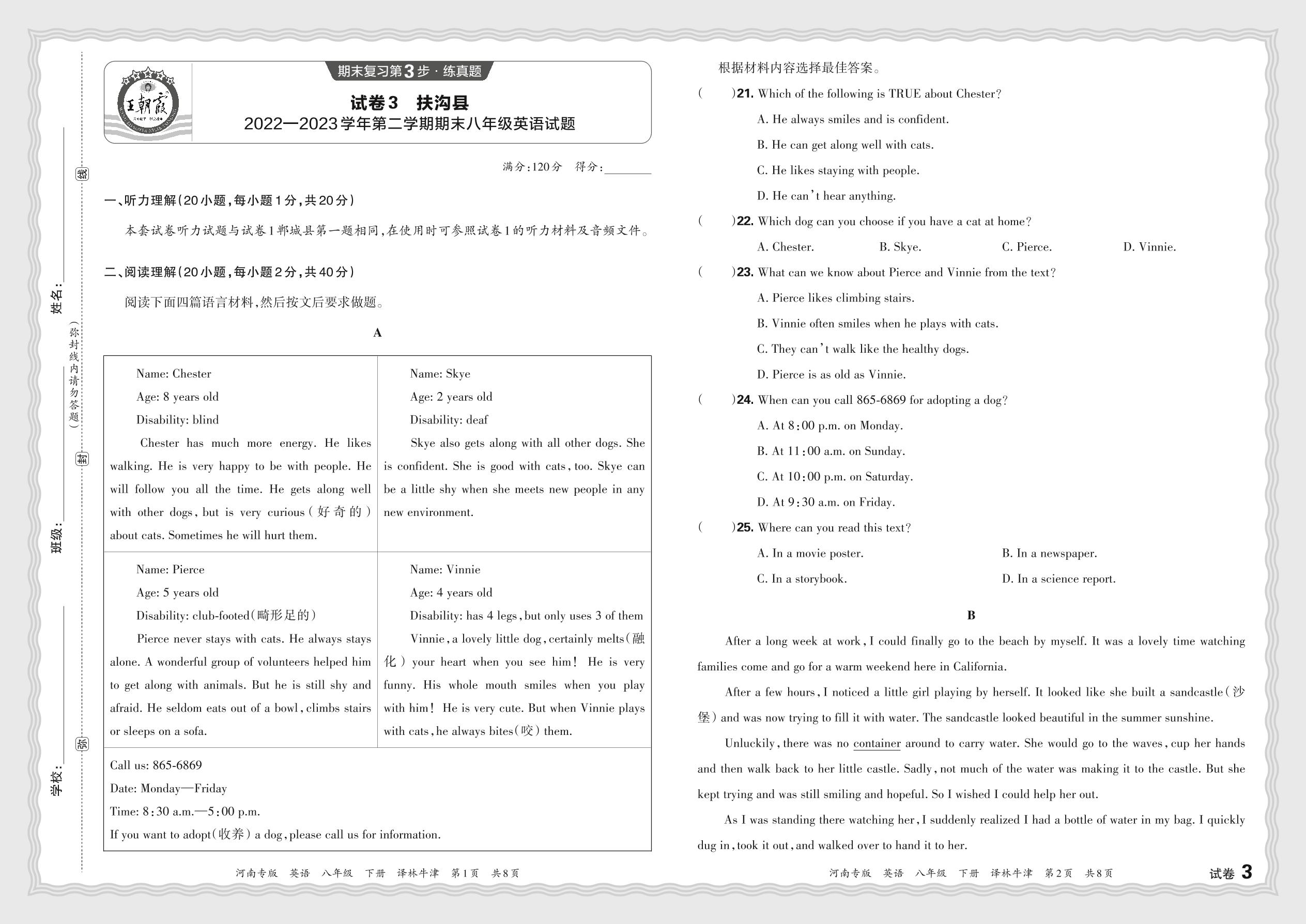 河南省扶沟县2022-2023学年第二学期期末八年级英语试题(译林牛津版)【3】
