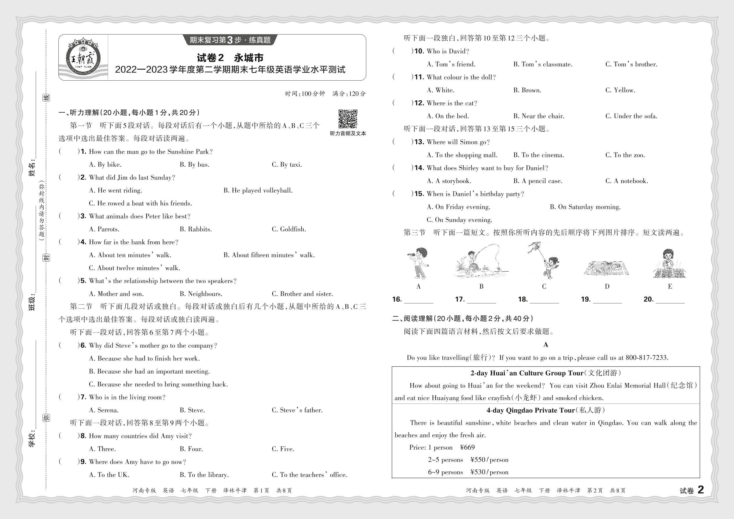 河南省永城市2022-2023学年度第二学期期末七年级英语学业水平测试(译林牛津版)【2】