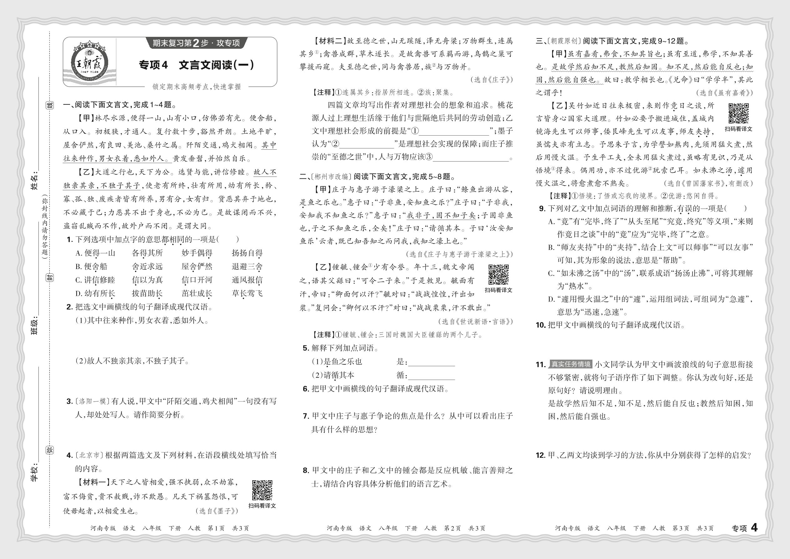 2024春下册八年级语文人教版 期末专项卷河南版·文言文阅读(一)【4】