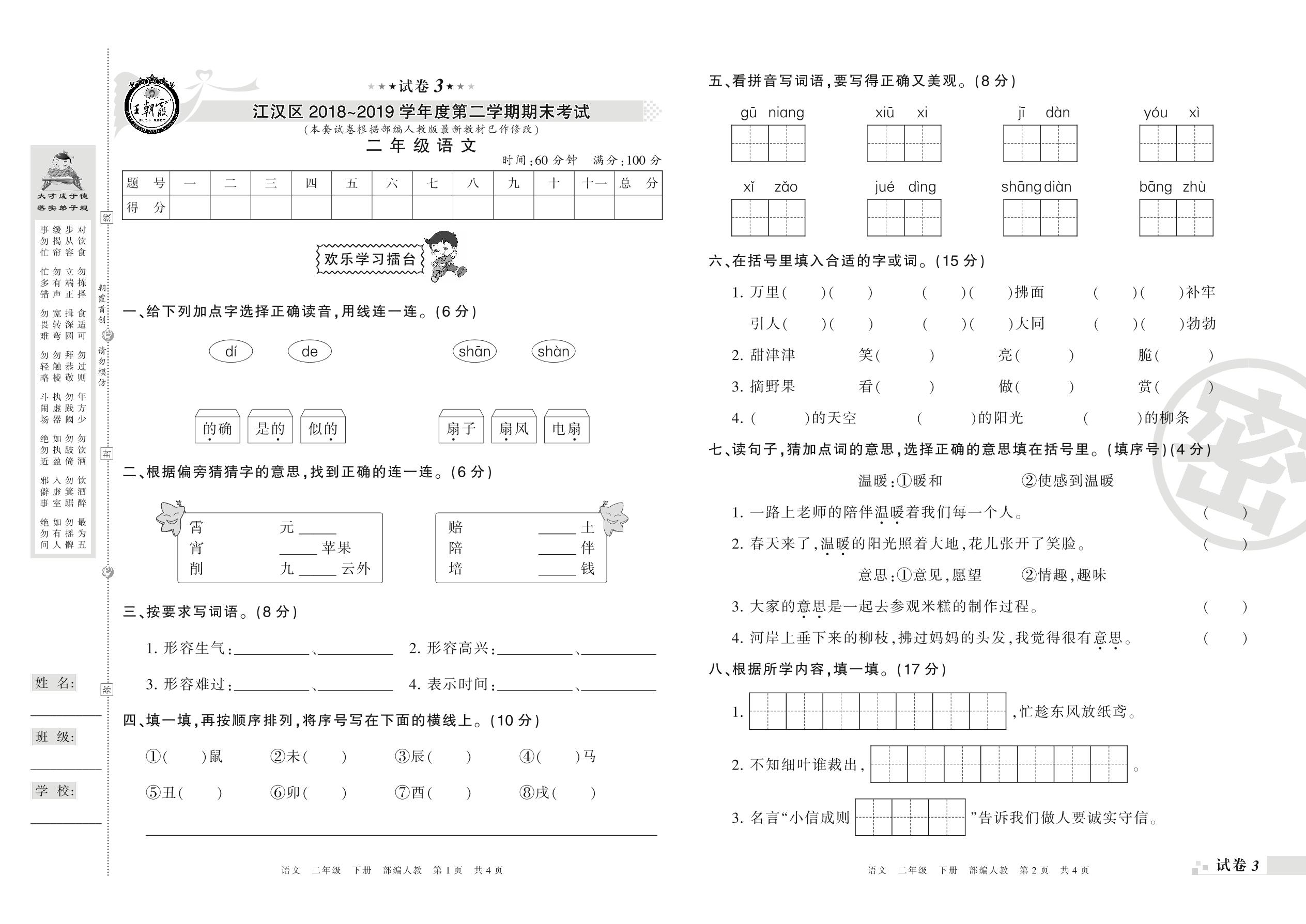 2018-2019学年第二学期武汉市江汉区二年级语文试卷(人教版)【3】