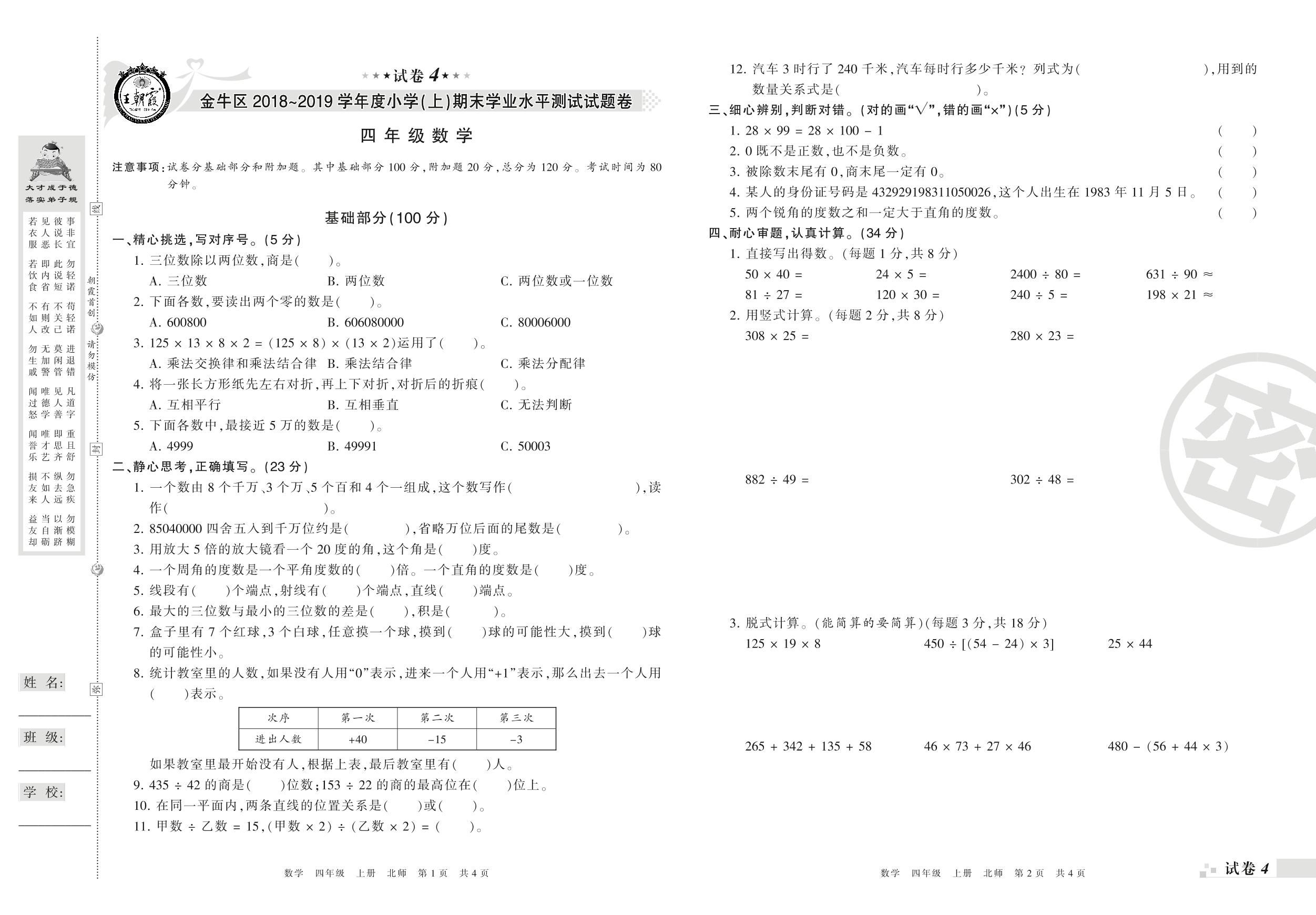 2018-2019学年第一学期成都市金牛区四年级数学试卷(北师版)【4】