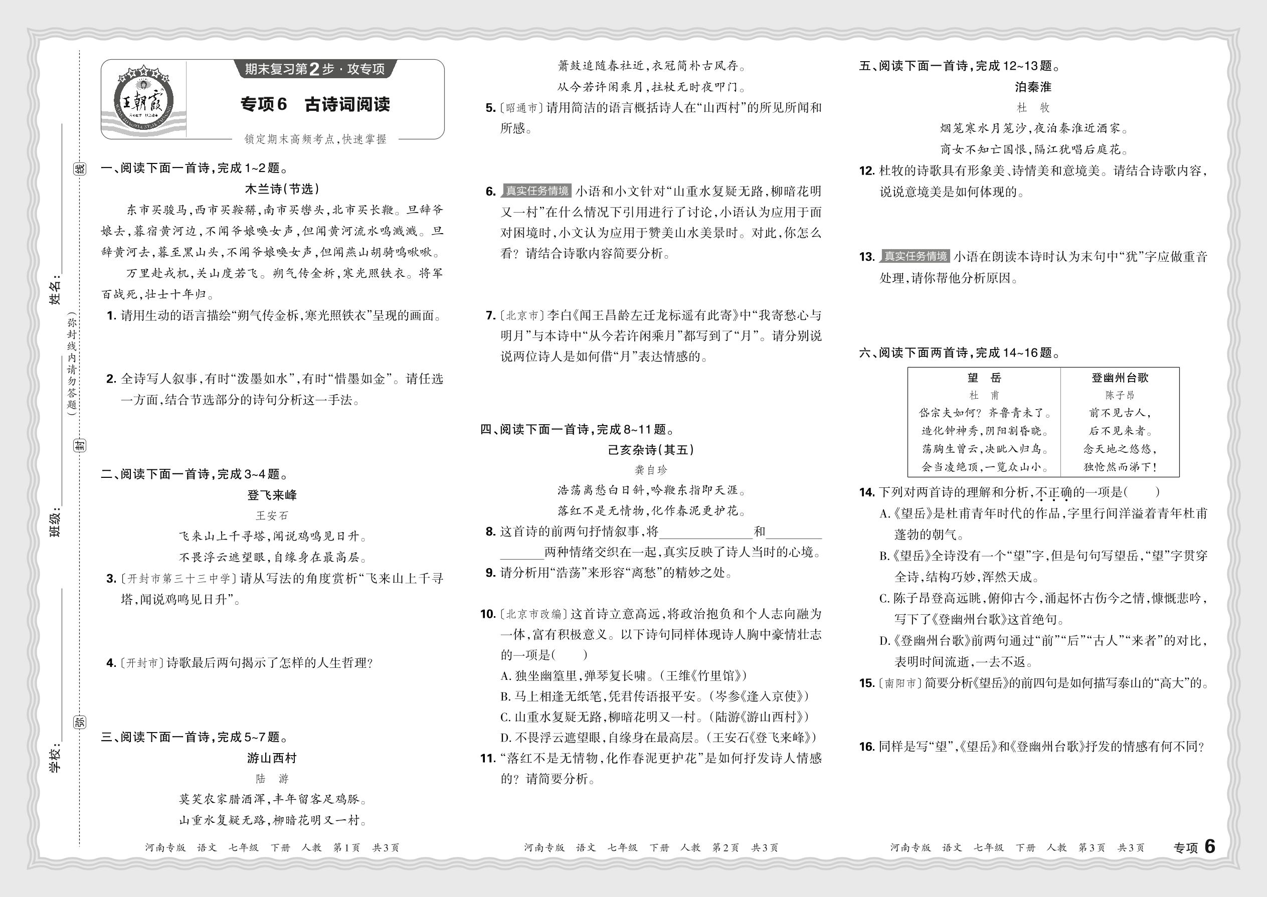 2024春下册七年级语文人教版 期末专项卷河南版·古诗词阅读【6】