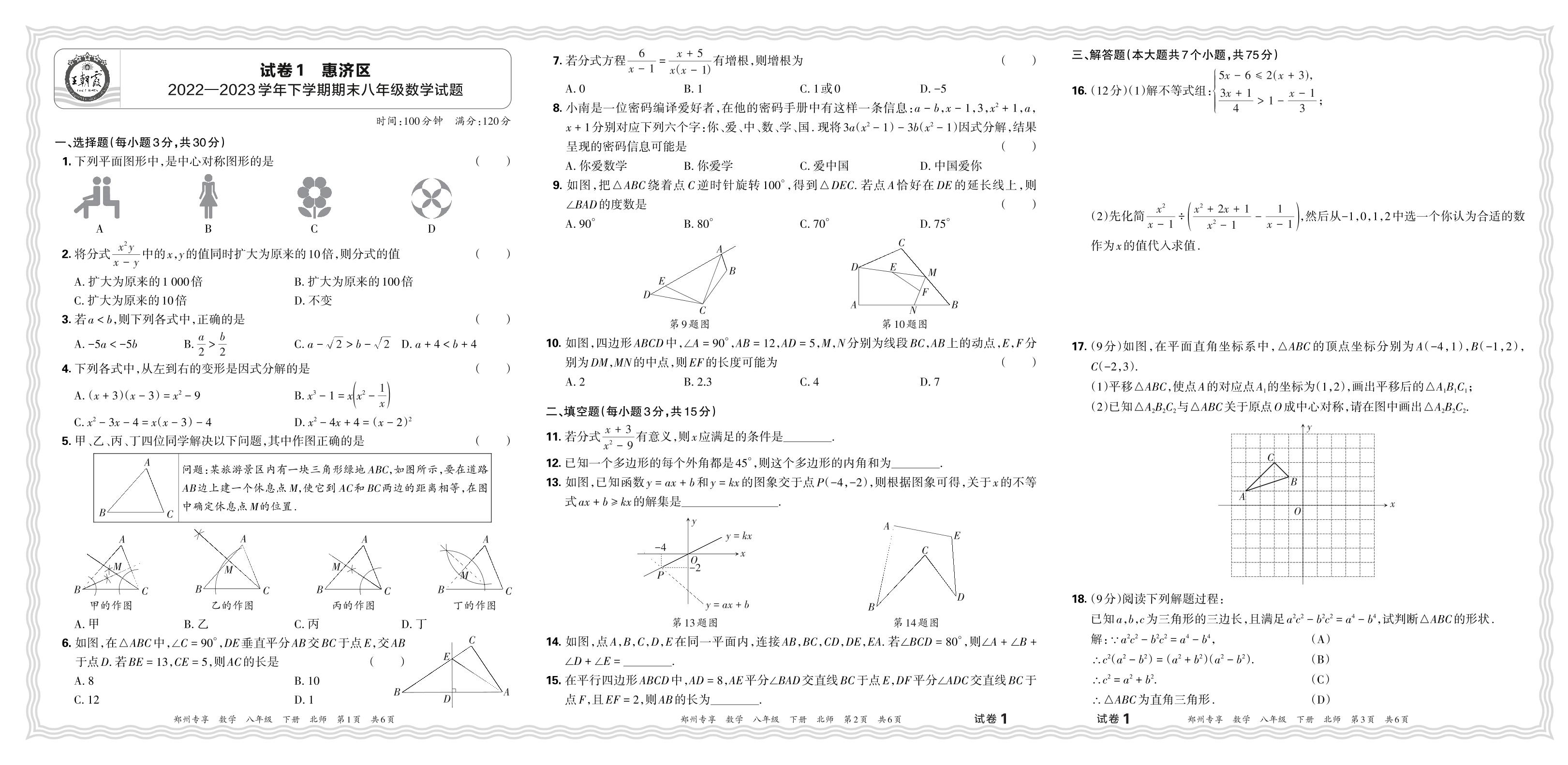 河南省郑州市惠济区2022-2023学年下学期期末八年级数学试题(北师版)【1】