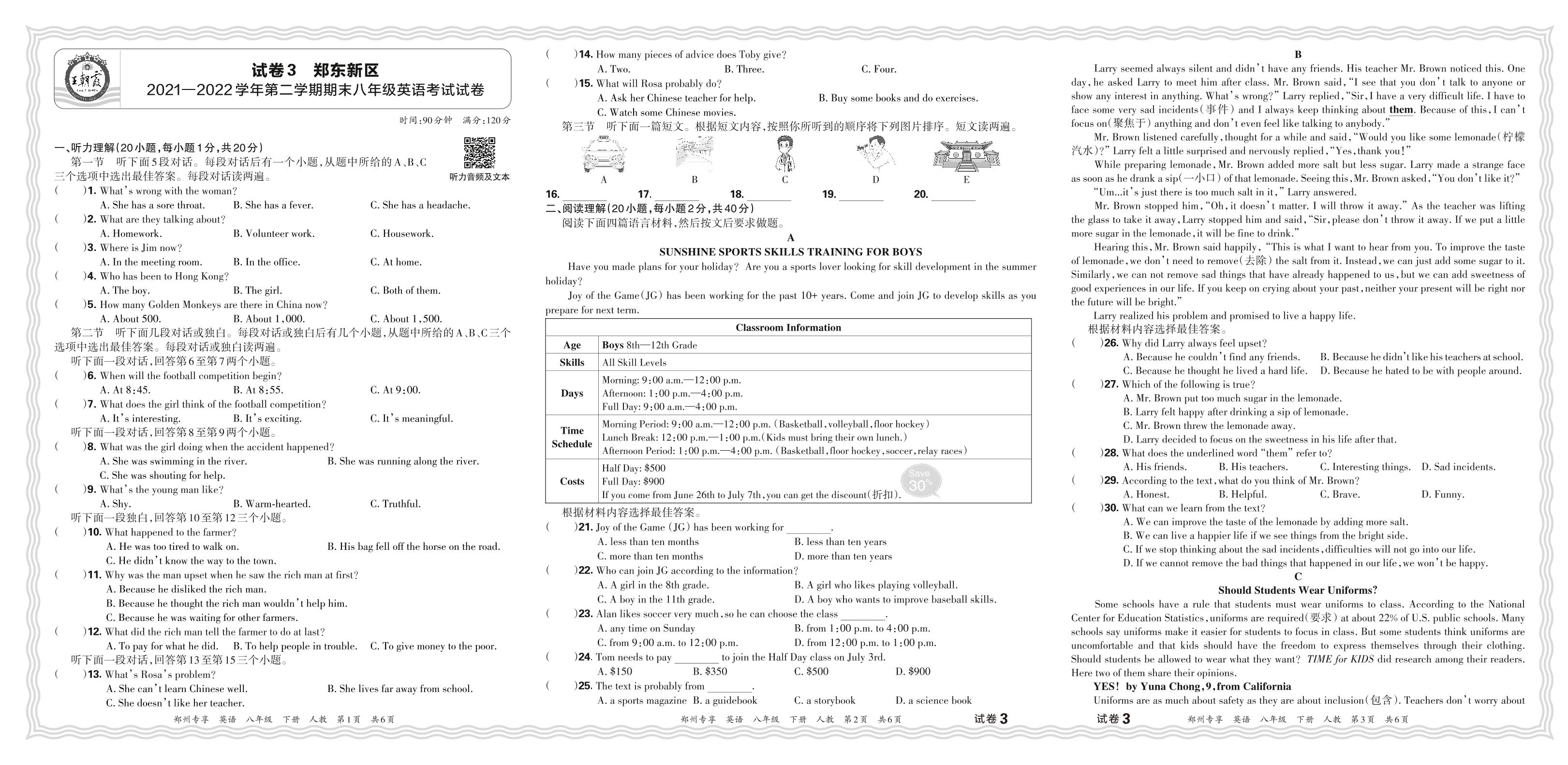 河南省郑州市郑东新区2021-2022学年第二学期期末八年级英语考试试卷(人教版)【3】