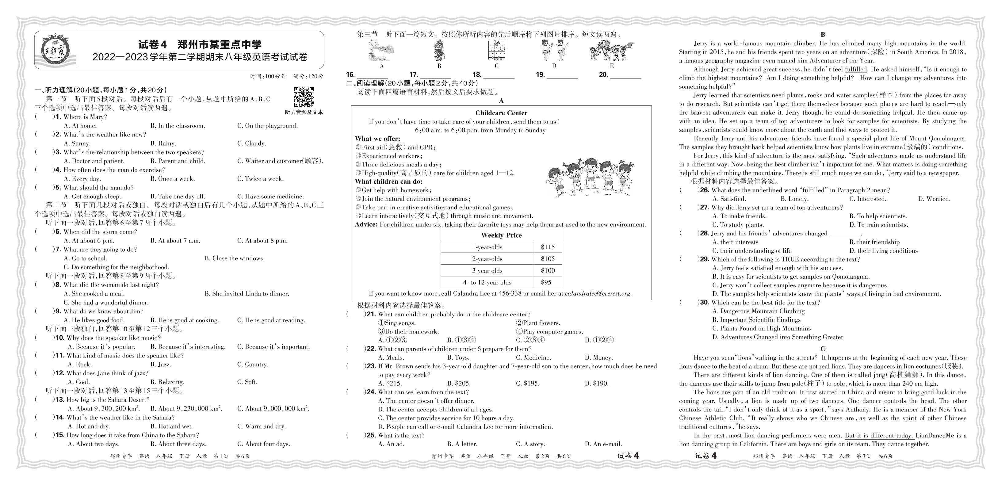 河南省郑州市某重点中学2022-2023学年第二学期期末八年级英语考试试卷(人教版)【4】