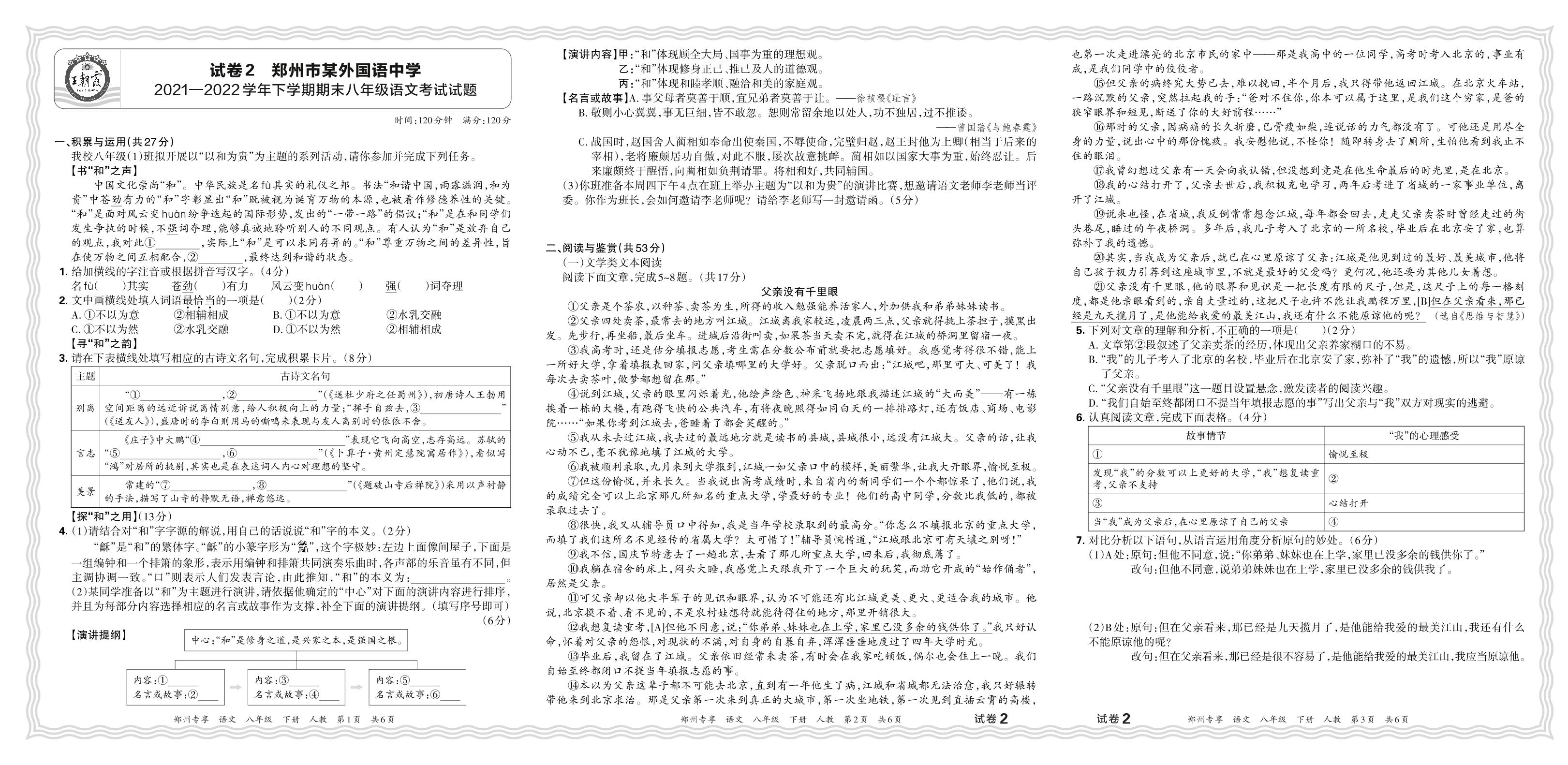 河南省郑州市某外国语中学2021-2022学年下学期期末八年级语文考试试题(人教版)【2】
