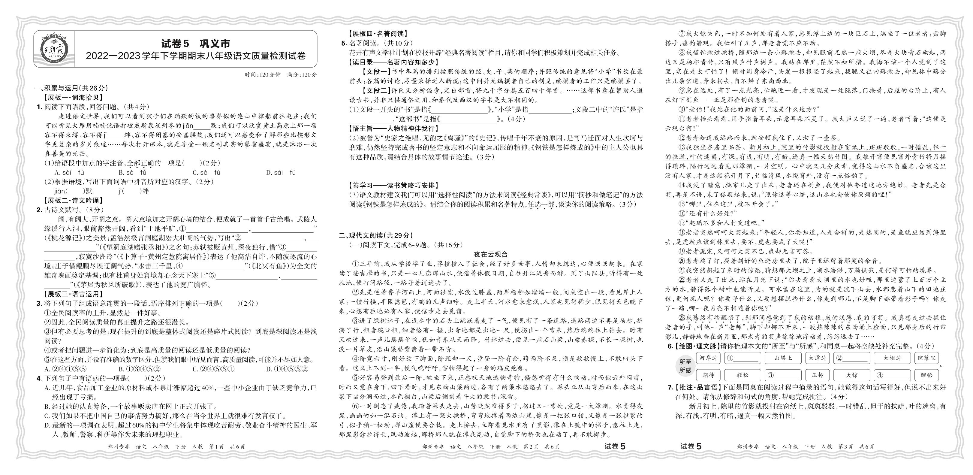河南省郑州市巩义市2022-2023学年下学期期末八年级语文质量检测试卷(人教版)【5】