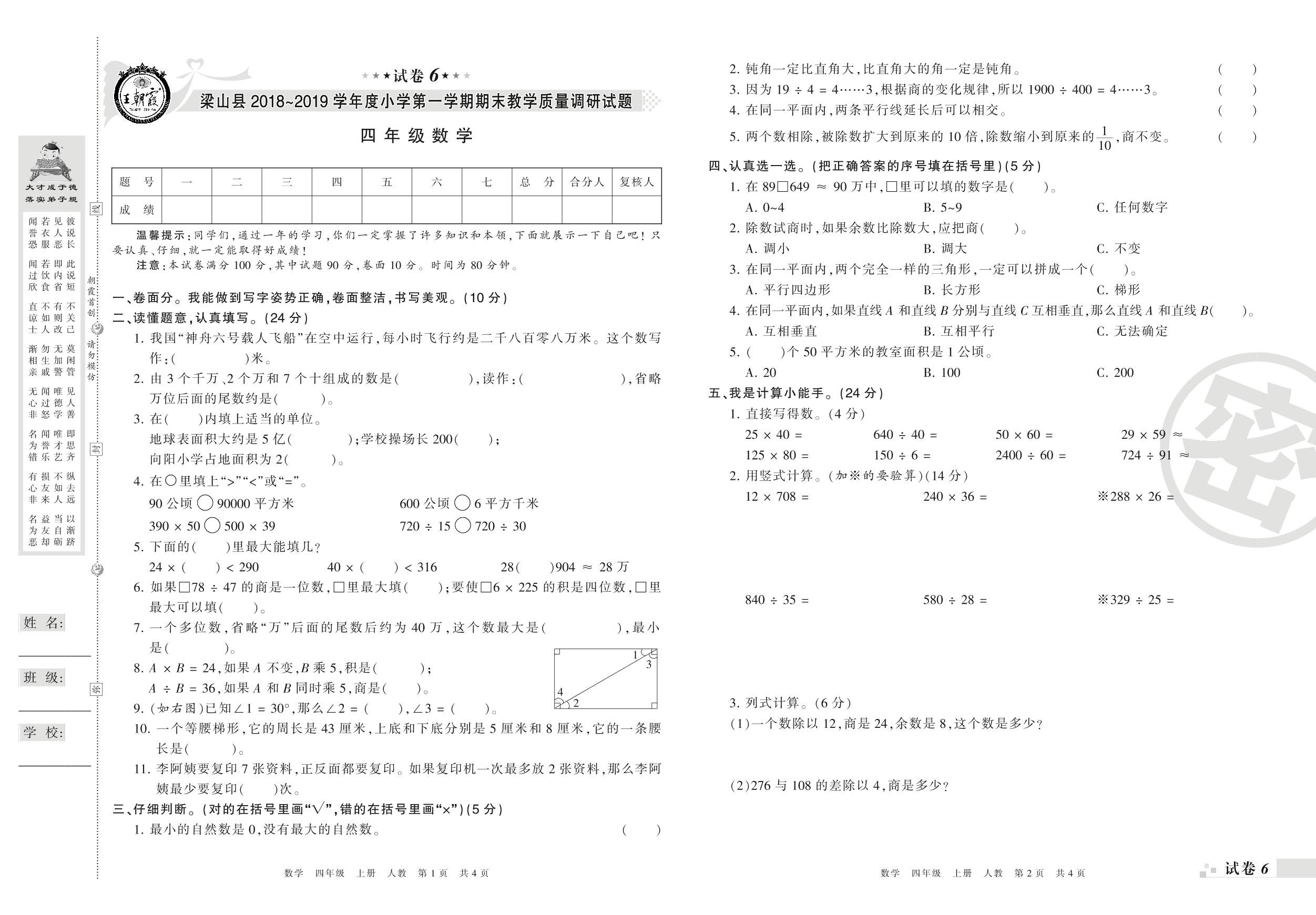 2018-2019学年第一学期济宁市梁山县四年级数学试卷(人教版)【6】