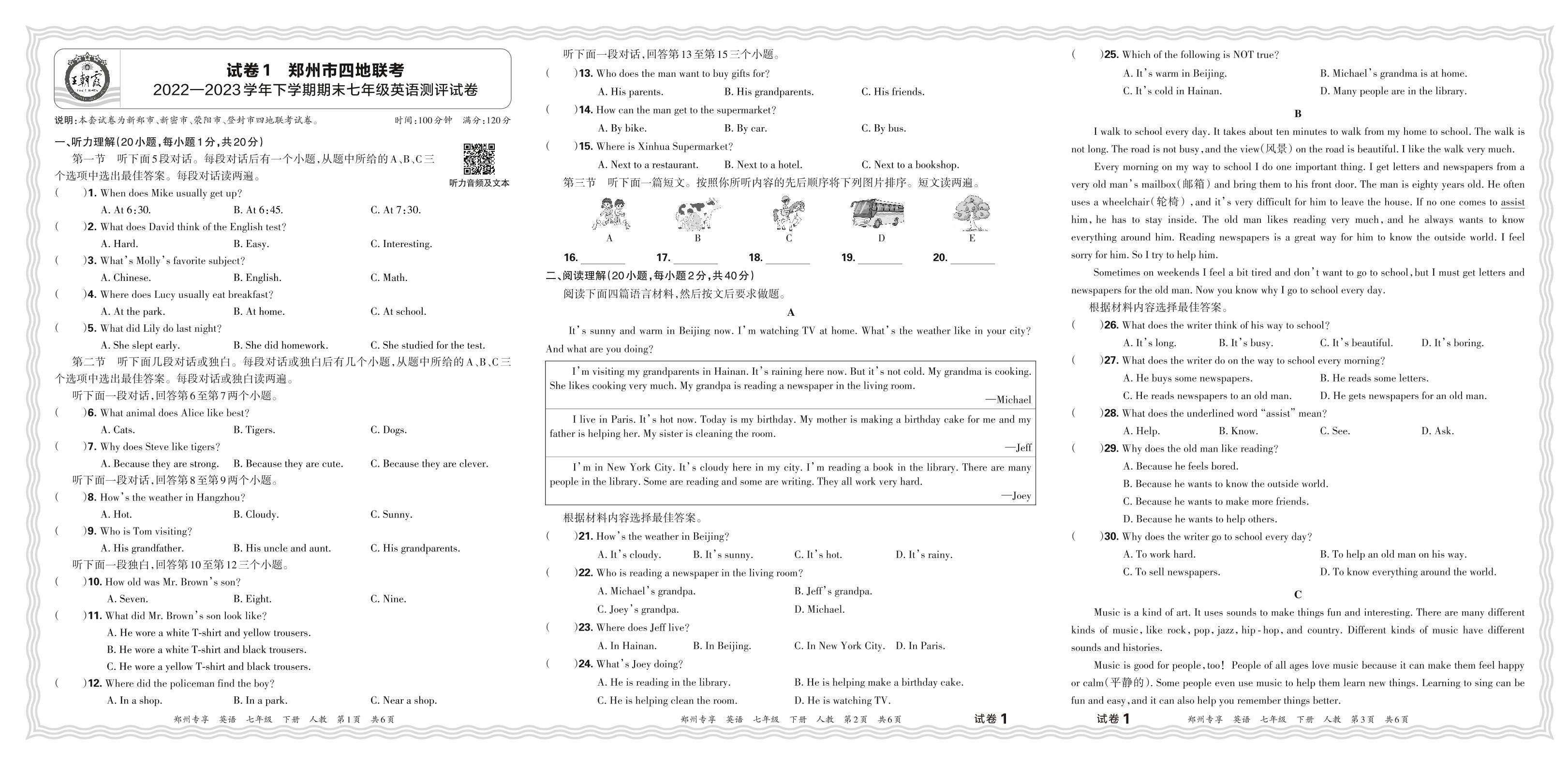 河南省郑州市四地联考2022-2023学年下学期期末七年级英语测评试卷(人教版)【1】