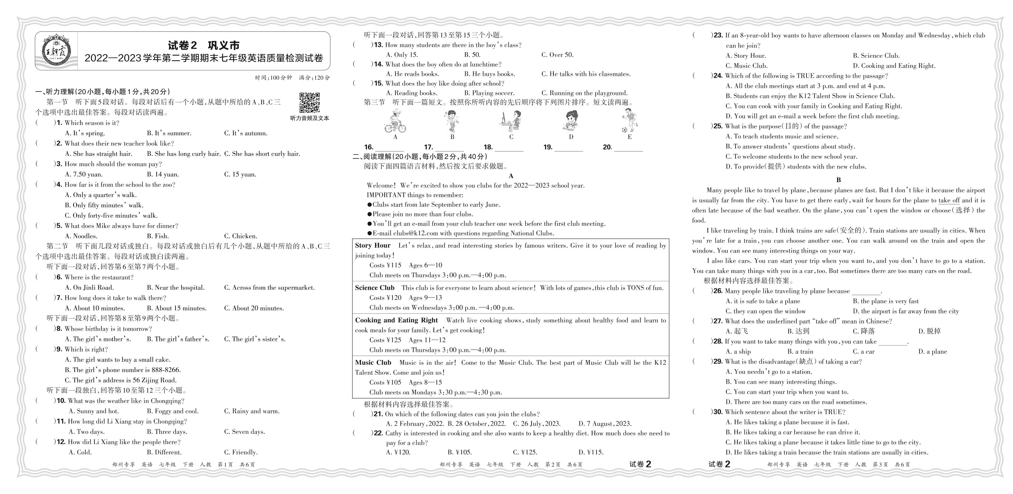 河南省郑州市巩义市2022-2023学年第二学期期末七年级英语质量检测试卷(人教版)【2】