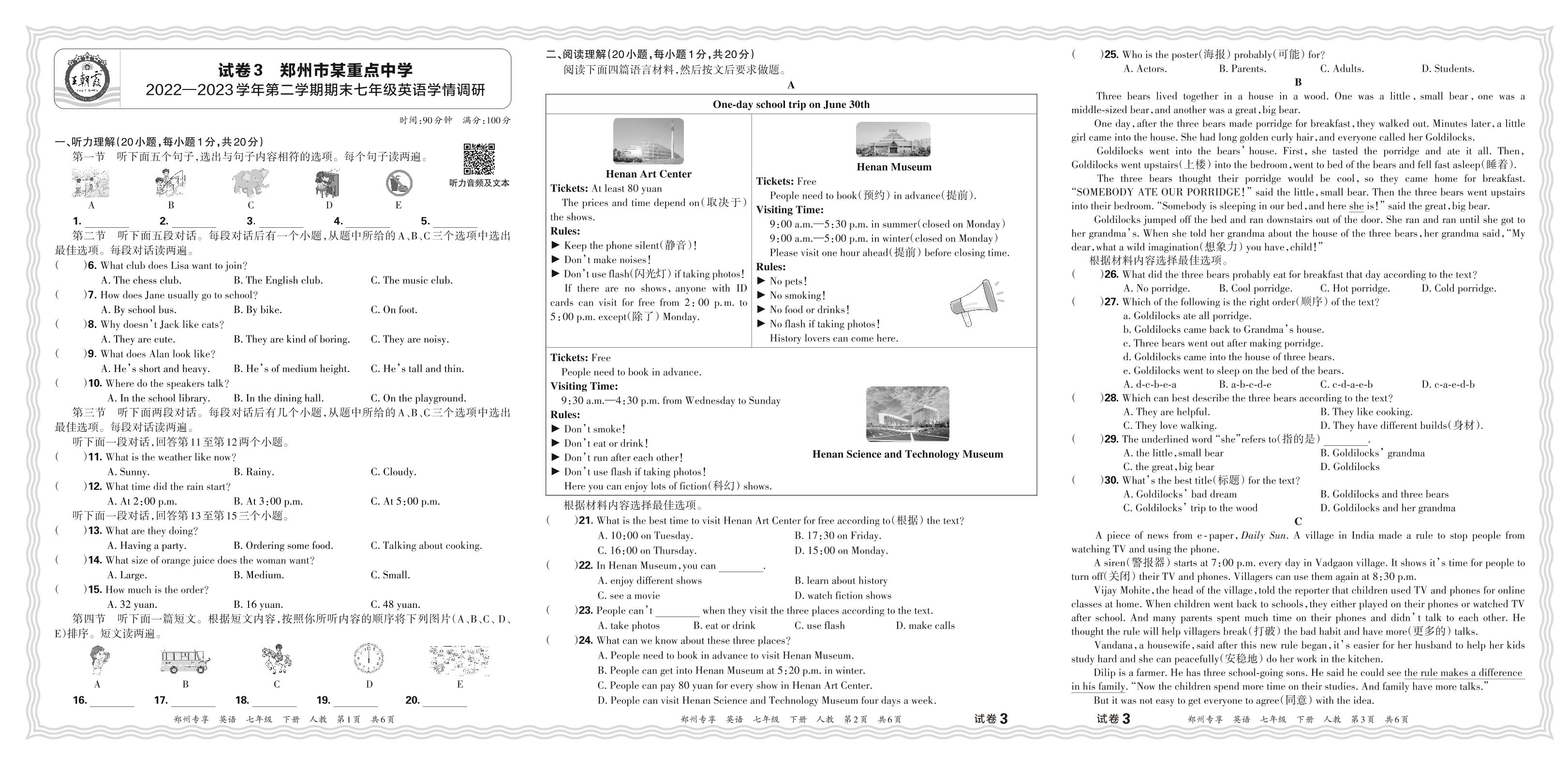 河南省郑州市某重点中学2022-2023学年第二学期期末七年级英语学情调研(人教版)【3】