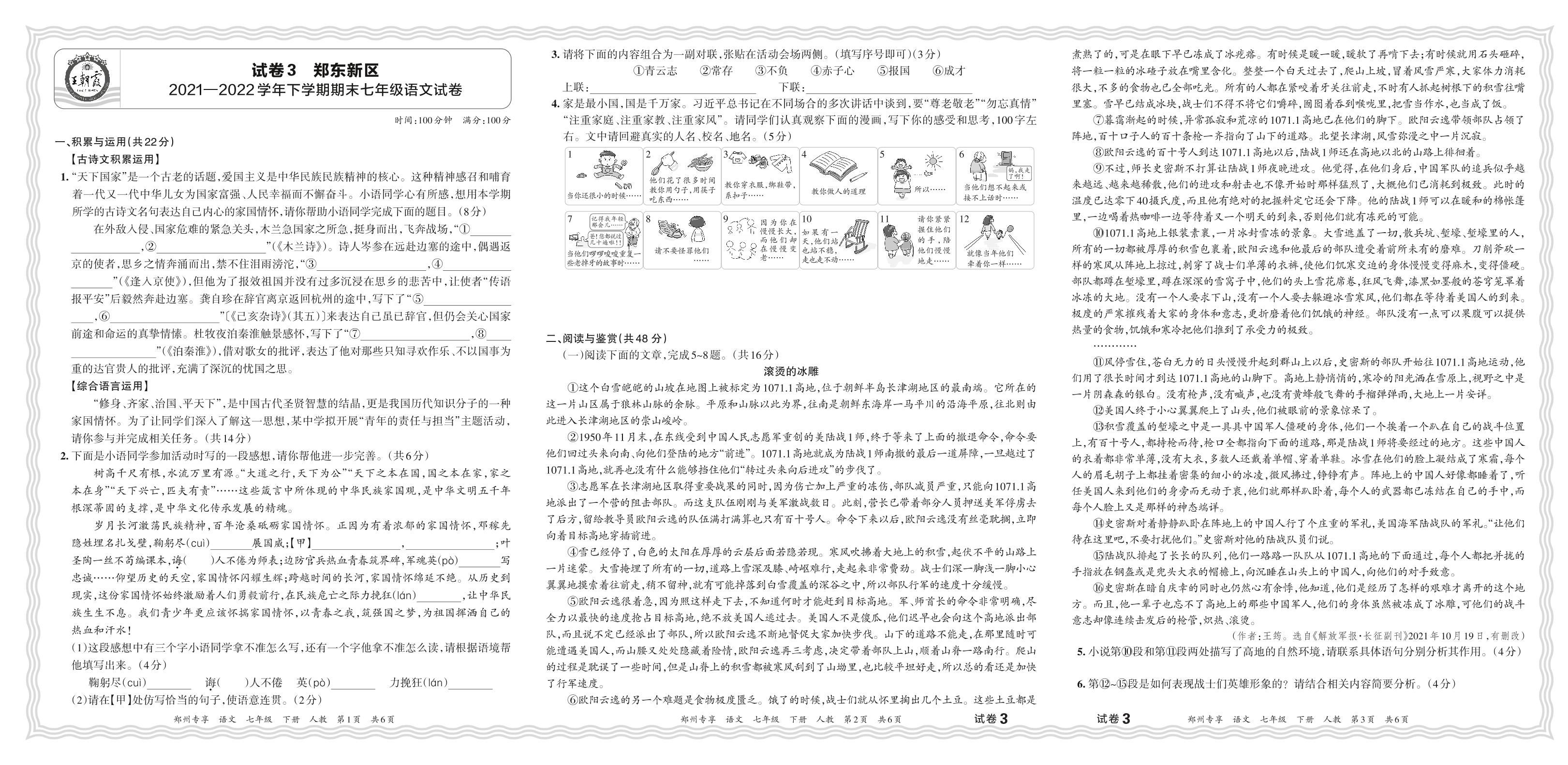 河南省郑州市郑东新区2021-2022学年下学期期末七年级语文试卷(人教版)【3】