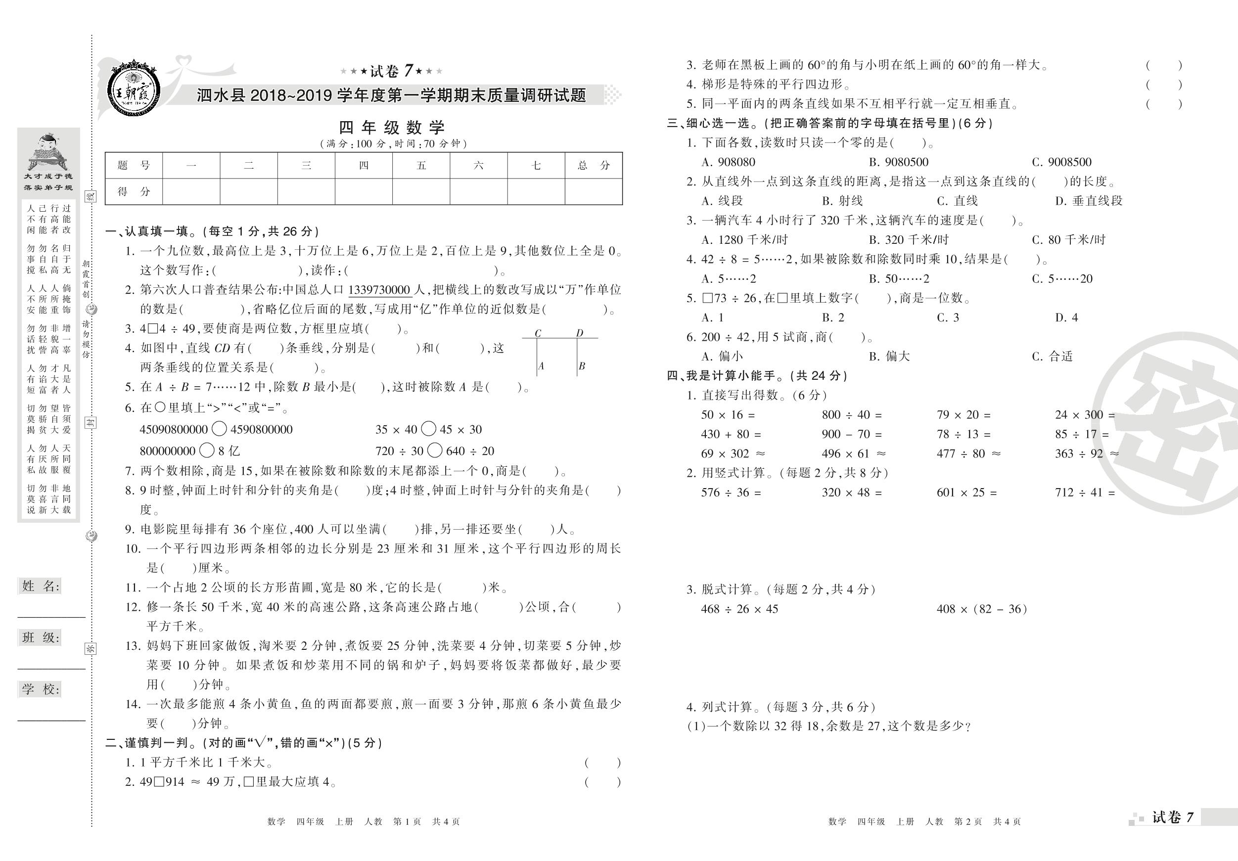 2018-2019学年第一学期济宁市泗水县四年级数学试卷(人教版)【7】