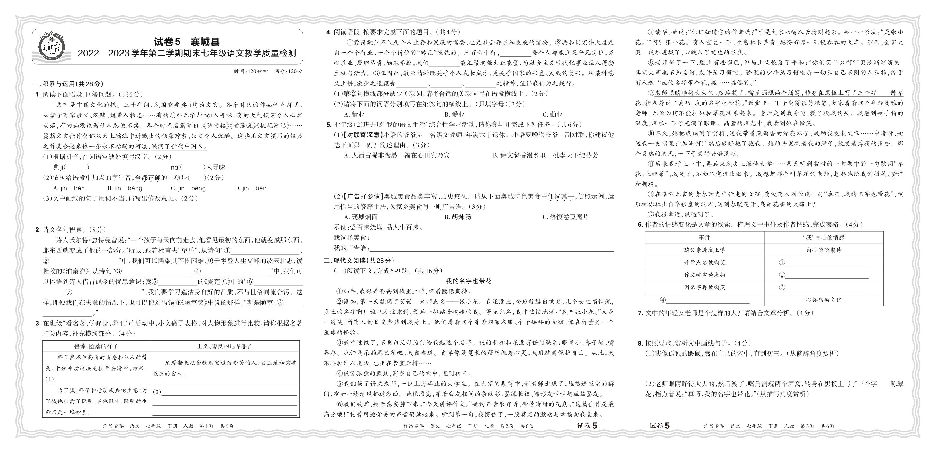 河南省许昌市襄城县2022-2023学年第二学期期末七年级语文教学质量检测(人教版)【5】