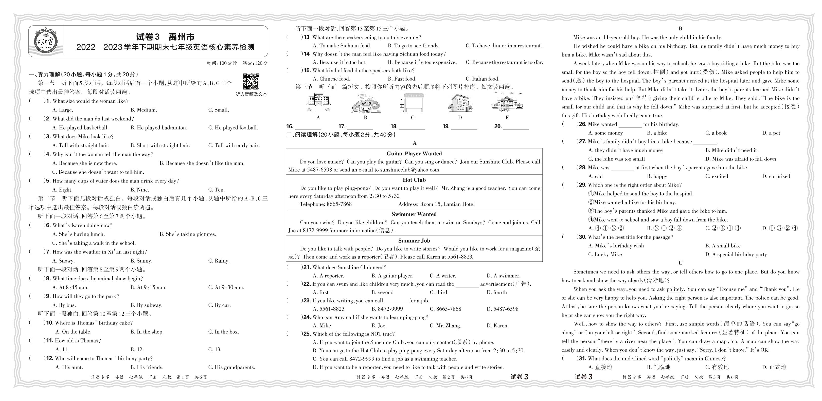 河南省许昌市禹州市2022-2023学年下学期期末七年级英语核心素养检测(人教版)【3】