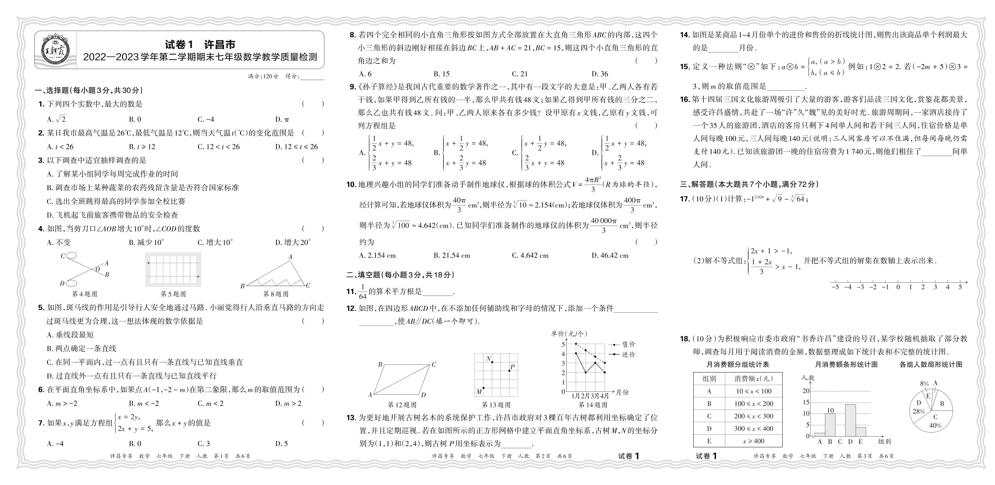 河南省许昌市2022-2023学年第二学期期末七年级数学教学质量检测(人教版)【1】