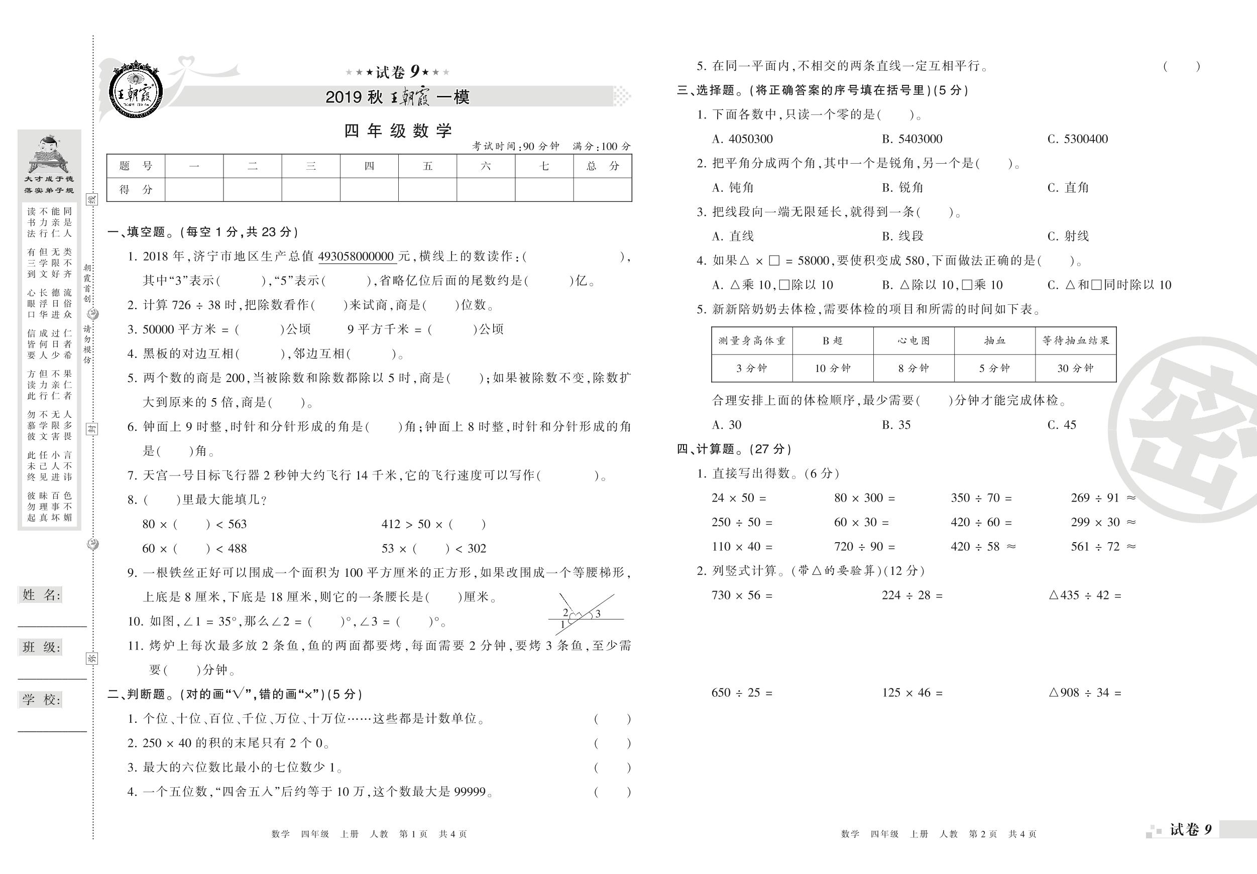 王朝霞期末模拟卷四年级上册数学(人教版)_R210804144805【9】