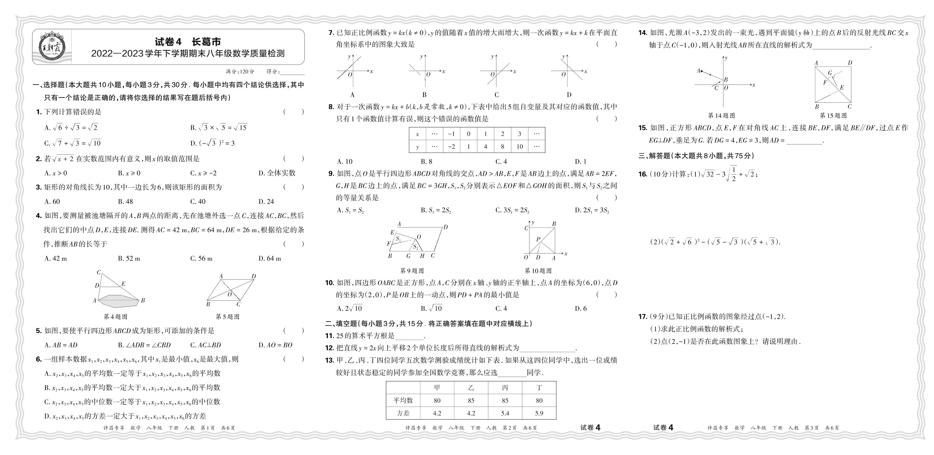 八年级数学人教版下册期末卷