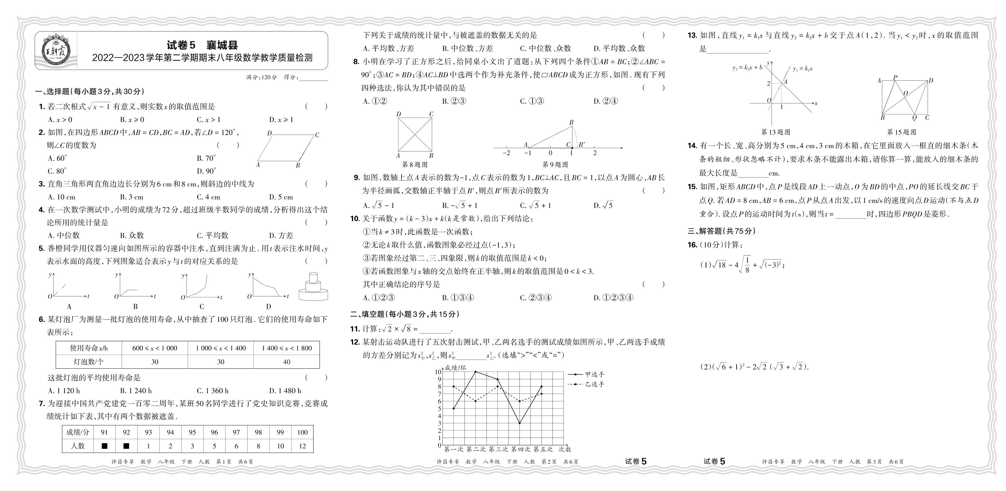 河南省许昌市襄城县2022-2023学年第二学期期末八年级数学教学质量检测(人教版)【5】