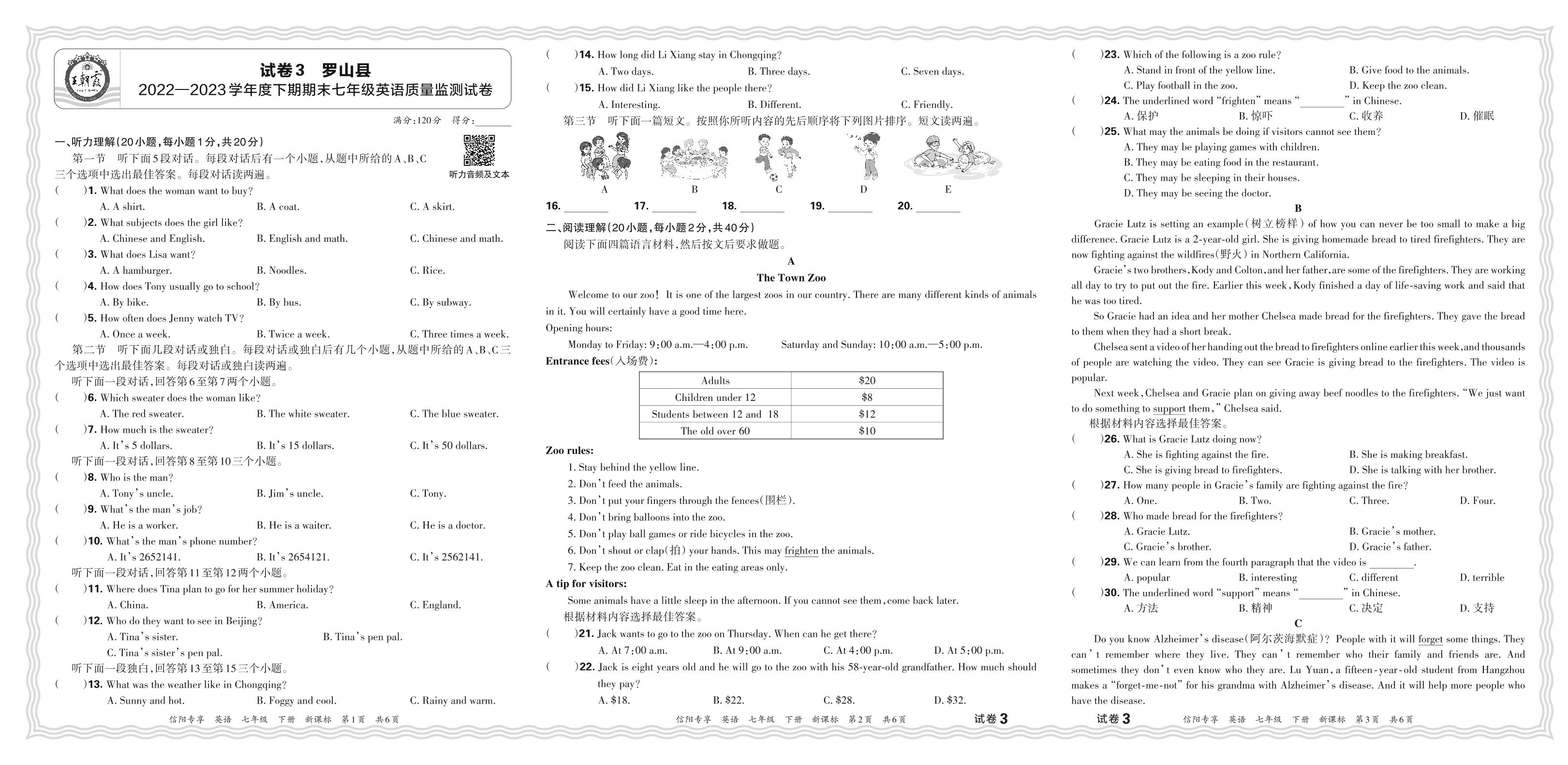河南省信阳市罗山县2022-2023学年度下期期末七年级英语质量监测试卷(新课标版)【3】