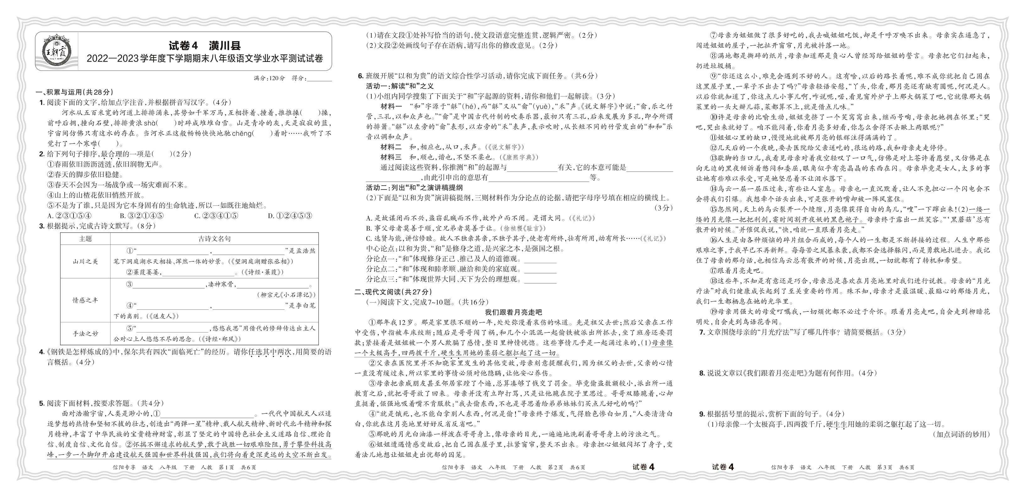河南省信阳市潢川县2022-2023学年度下学期期末八年级语文学业水平测试试卷(人教版)【4】