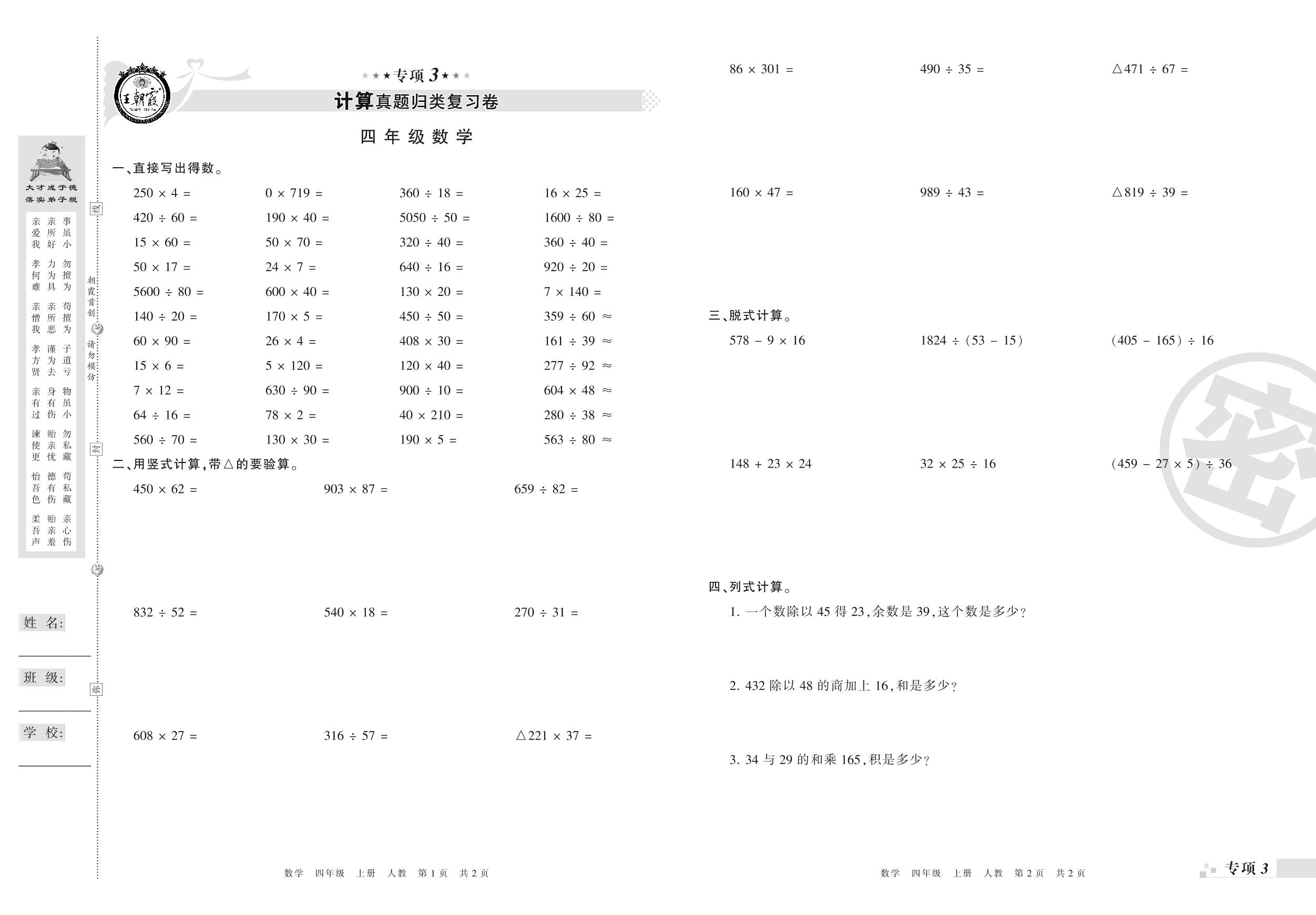 王朝霞期末专项卷——计算、解决问题真题归类复习四年级上册数学(人教版)_R210804144822【0】