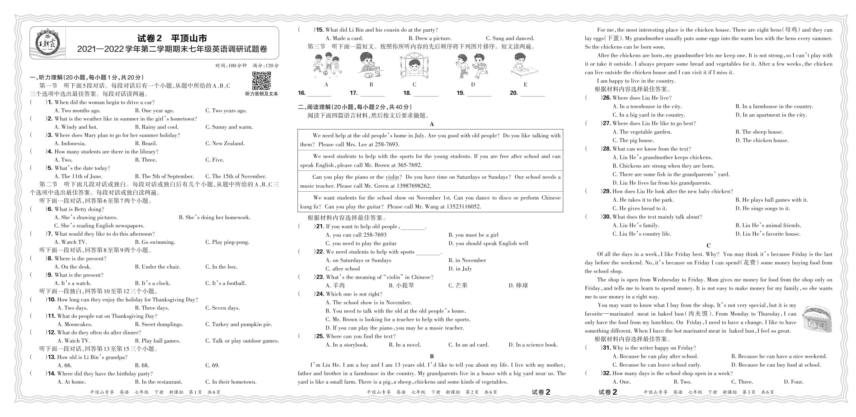 河南省平顶山市2021-2022学年第二学期期末七年级英语调研试题卷(新课标版)【2】