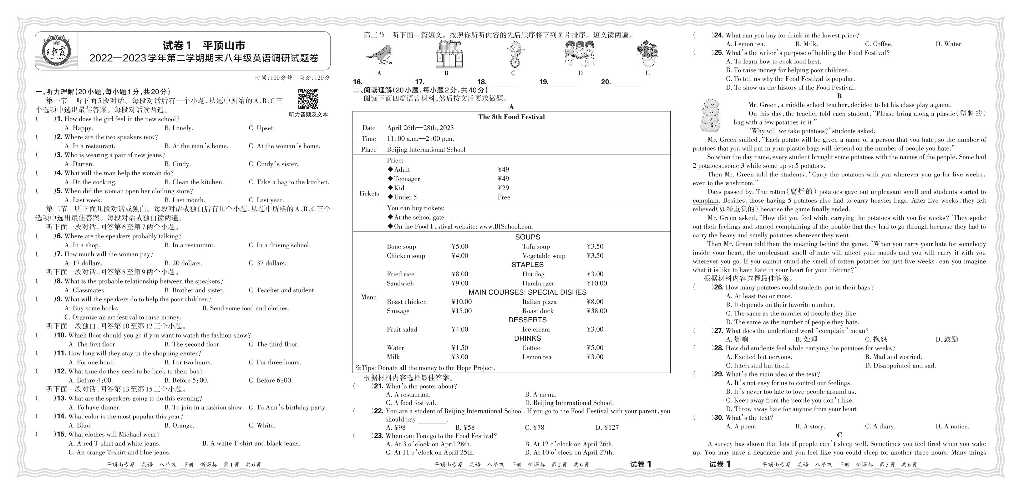 河南省平顶山市2022-2023学年第二学期期末八年级英语调研试题卷(新课标版)【1】