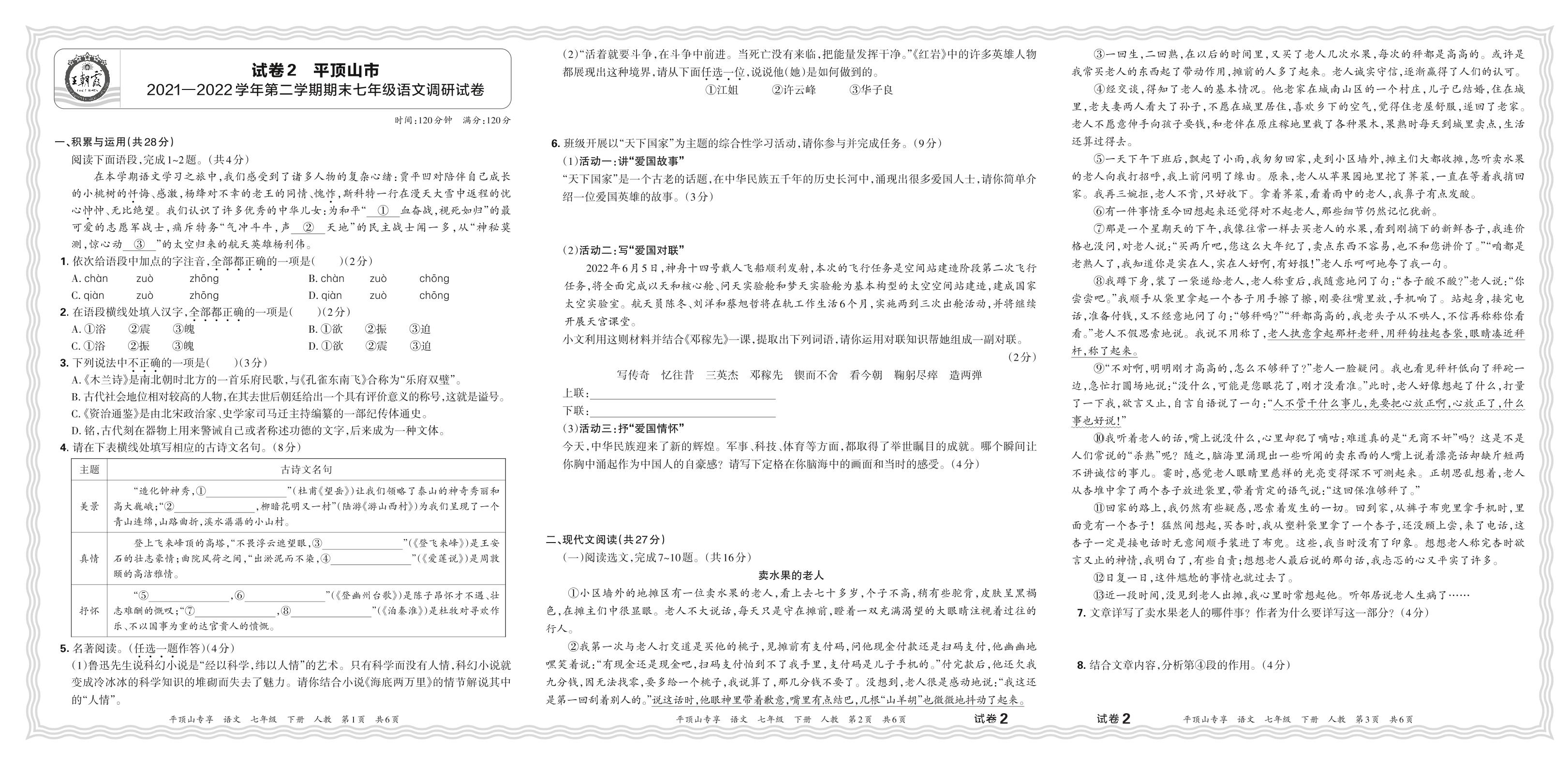 河南省平顶山市2021-2022学年第二学期期末七年级语文调研试卷(人教版)【2】
